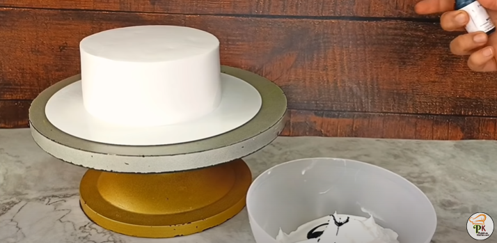 - Now cover the cake with white cream. Even and smoothen the sides and top part with a plain card scrapper. Now for designing, take 2 tbsp of whipped cream and add 2 drops of royal blue food color gel. Mix well and fill it in a pipping bag.