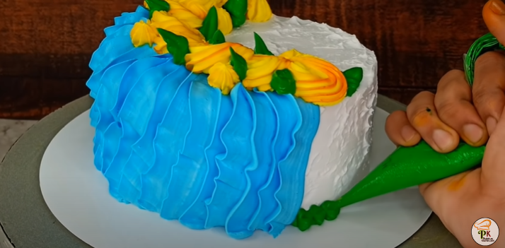- Next, using a star nozzle make yellow roses and small dots on the top of the cake near the blue waves.