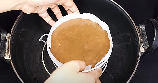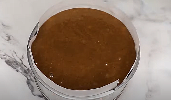 • Line a 4-inch baking pan with Oddy Ecobake. Transfer the batter into it, spread it out, and tap it well. Preheat a pan for 10 minutes with a wire stand in it. Cover and bake the cake for 45 minutes on a low flame.
