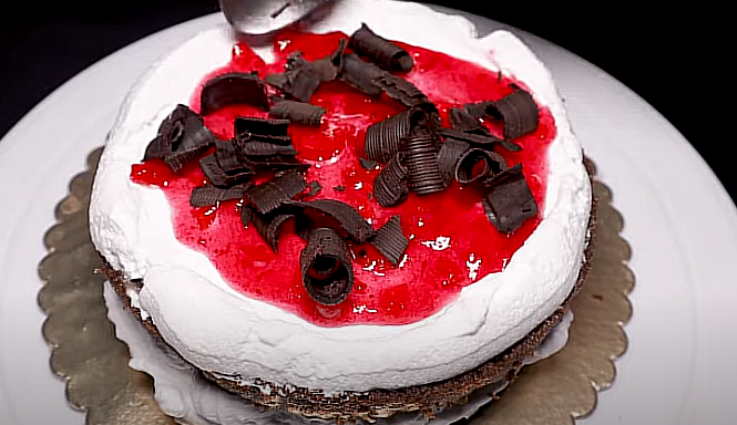 • Garnish with chocolate curls. Repeat the process for other layers, too. Frost the cake with cream, cover, and smooth. Refrigerate for 2 to 3 hours. Arrange chocolate sticks on the sides.