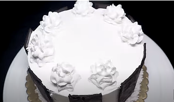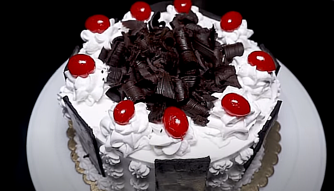 • Decorate with whipped cream filled in a piping bag on the top and sides as shown. Top it with cherries and chocolate curls. The eggless black forest cake is ready. Cut it into slices and enjoy.