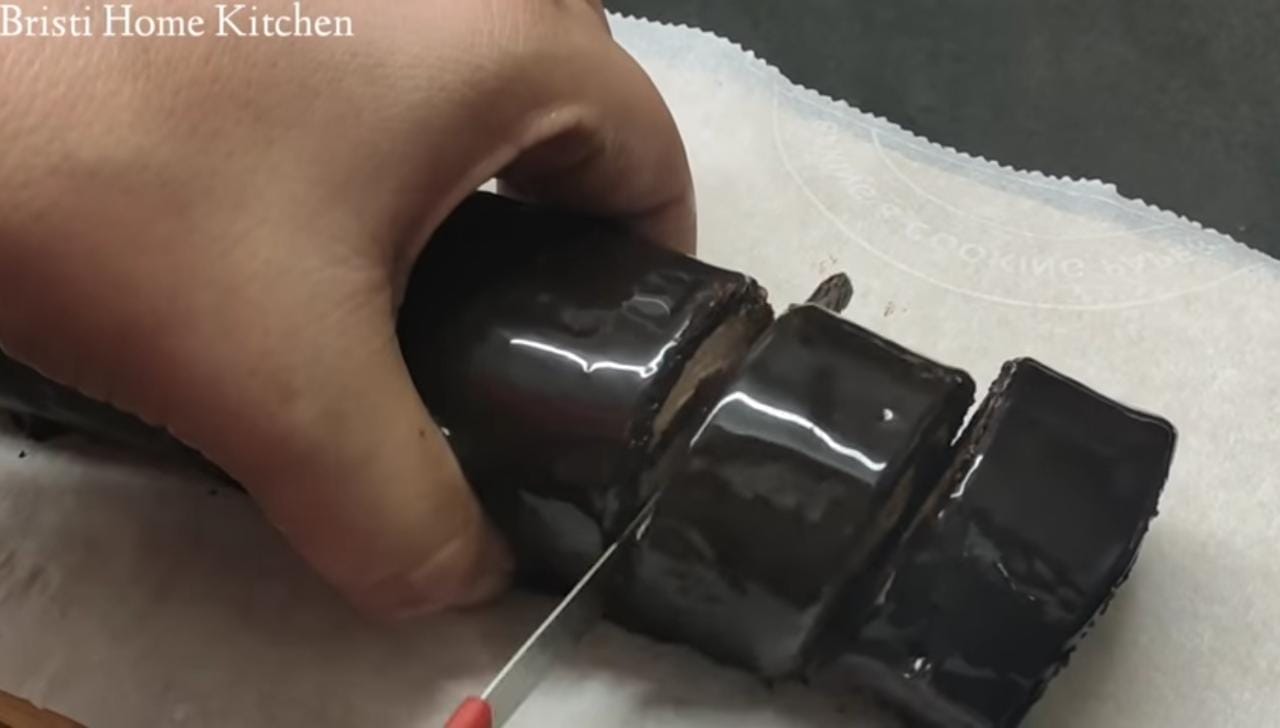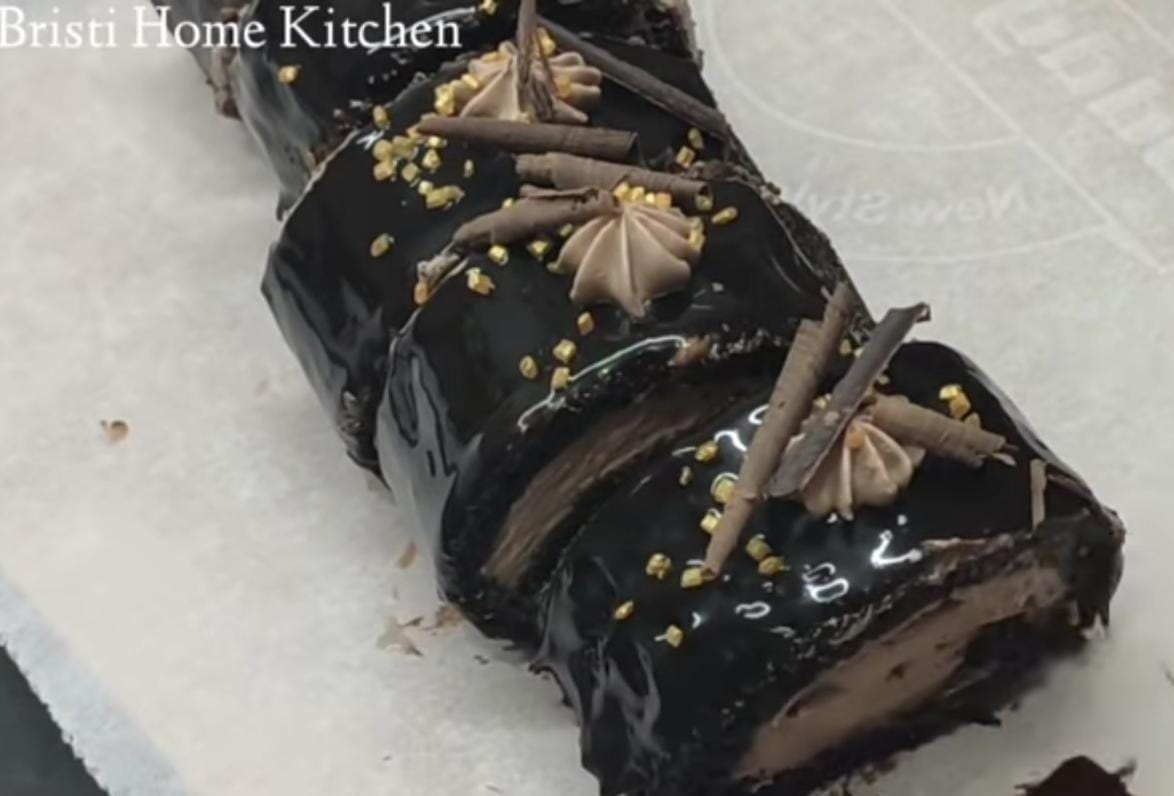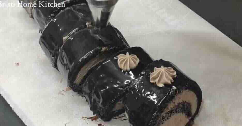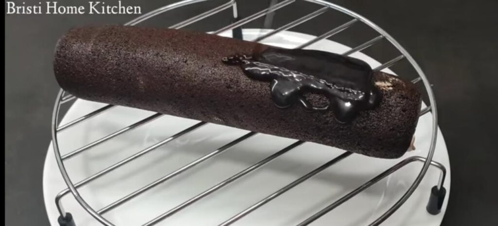 • Refrigerate this roll for 30 minutes. After 30 minutes, take it out and place it on a steel rack. Pour the leftover chocolate ganache on it.