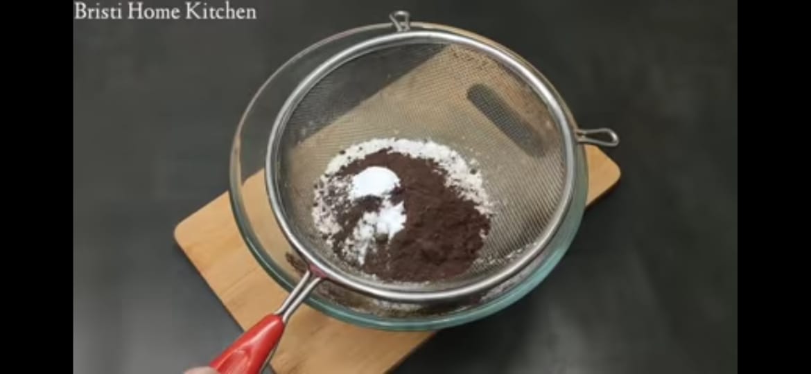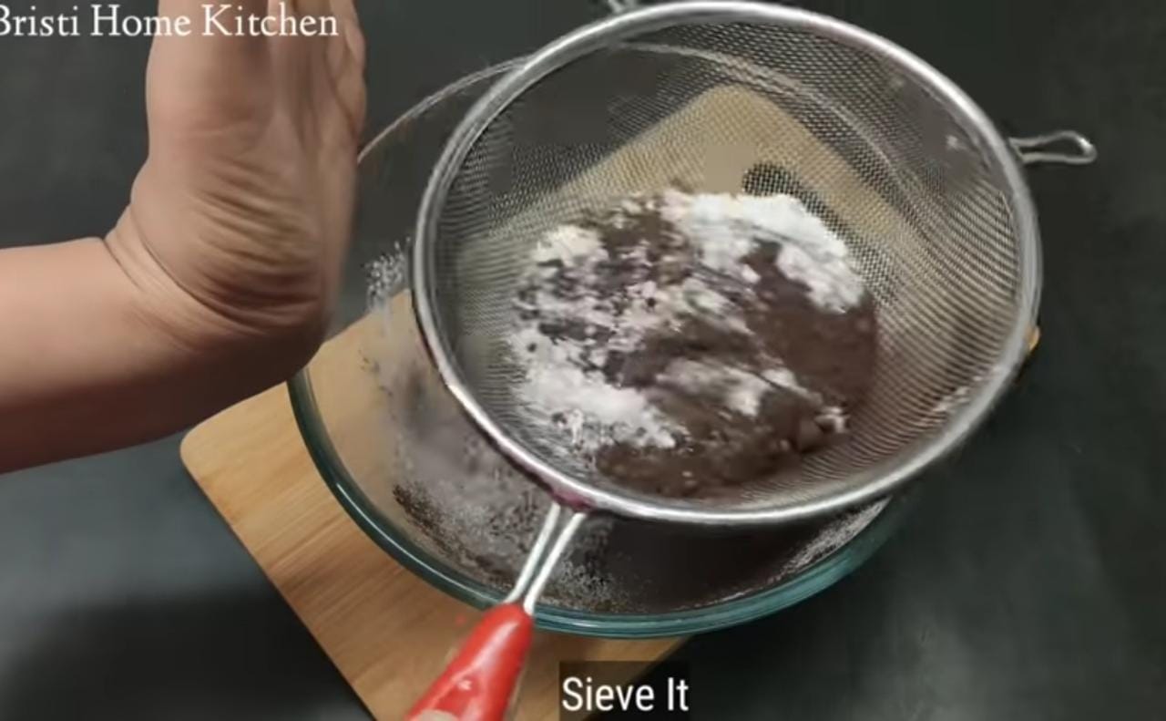 • Put a strainer over the above bowl containing liquid ingredients and sieve refined flour, cocoa powder, baking powder and baking soda in it. Mix well using a whisker.