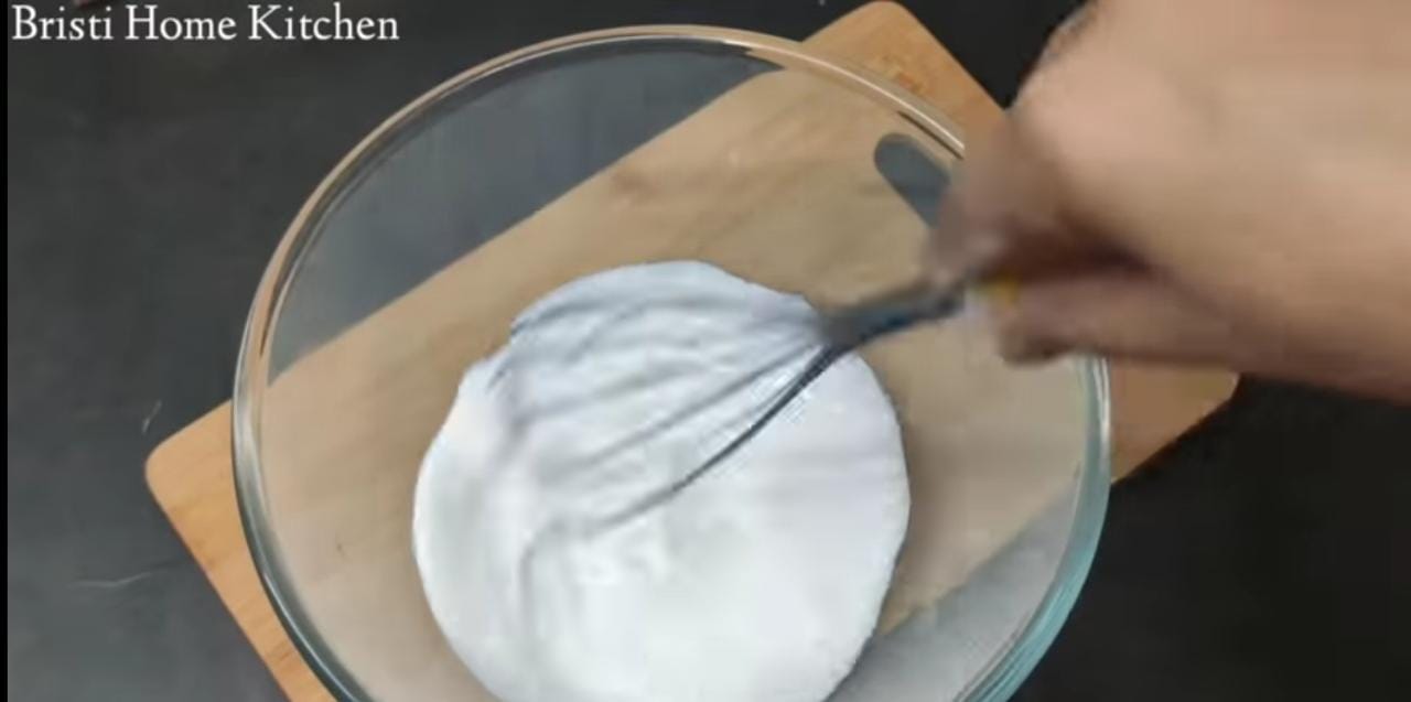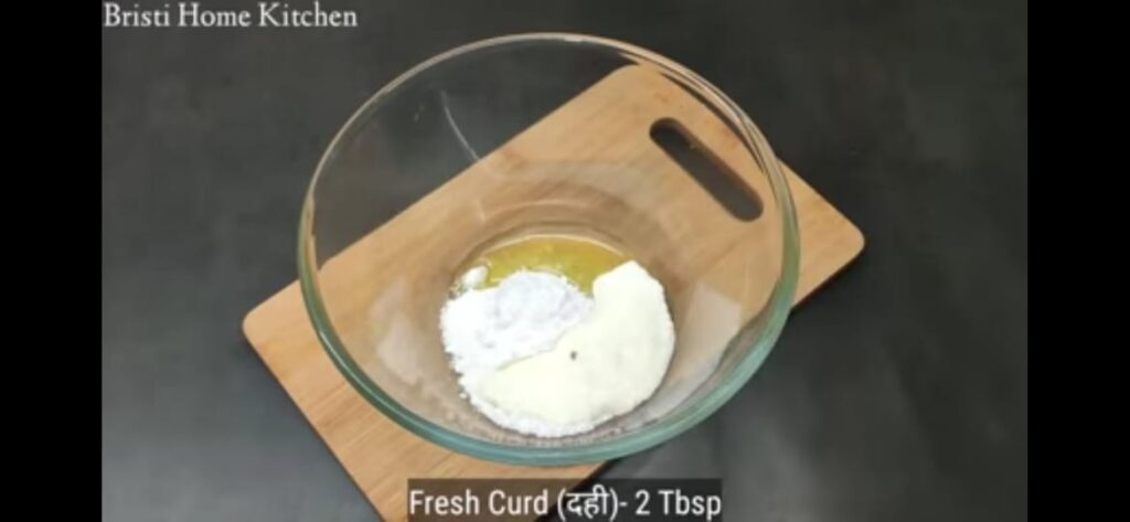 • In a bowl, take sugar, oil and fresh curd in mentioned quantities. Whisk them together till smooth.
