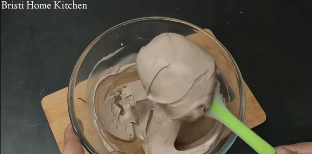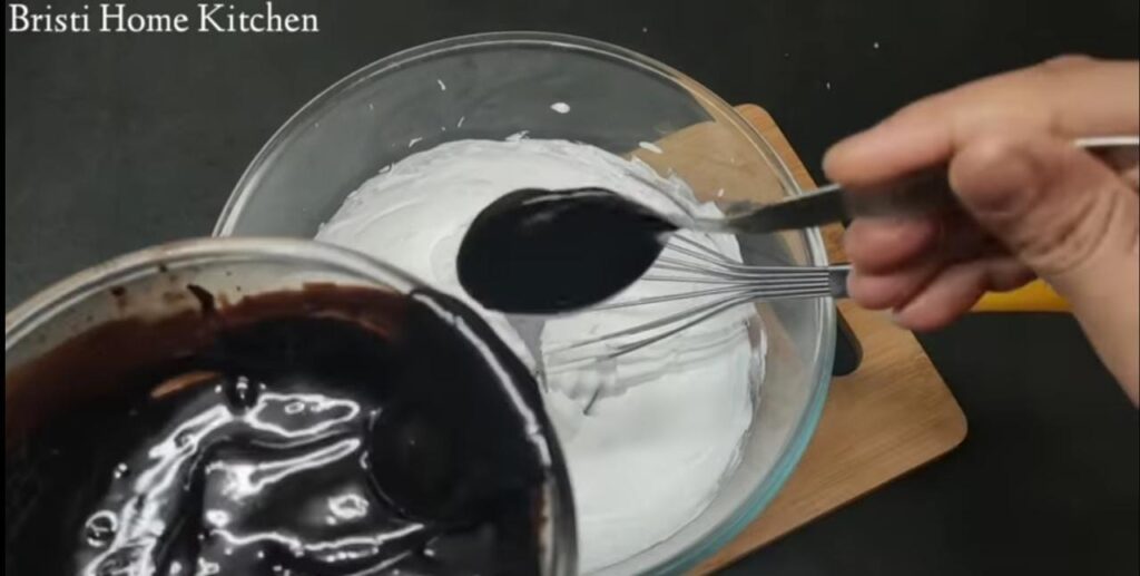 • In another huge bowl, whisk whipped cream till its smooth, fluffy and light. To this, add 2 Tbsp of the prepared chocolate ganache. Mix these well for a rich chocolate frosting.