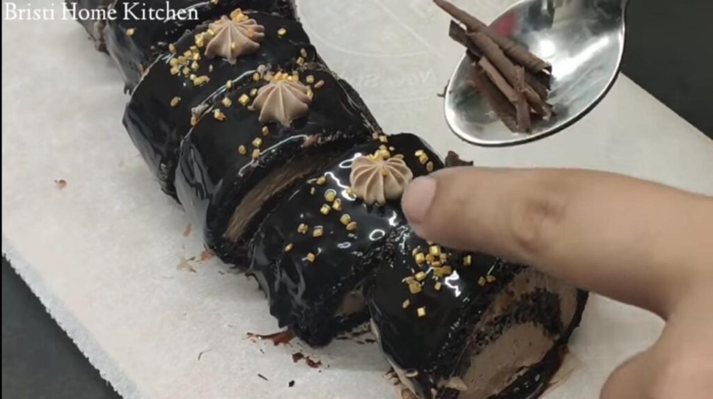 • Now cut the swiss roll in fine pieces. Garnish them with chocolate frosting and golden sugar. Finish it with chocolate curls on top. Your yumilicious super chocolaty swiss roll is ready to be served.