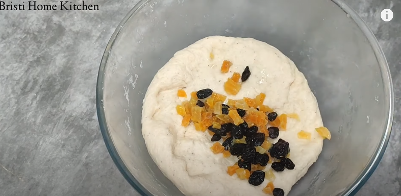 - Squeeze the water and add the soaked raisins and apricots. Knead again mixing the dry fruits. Cover the dough in cling wrap and let it rest for 2 hours.