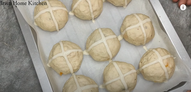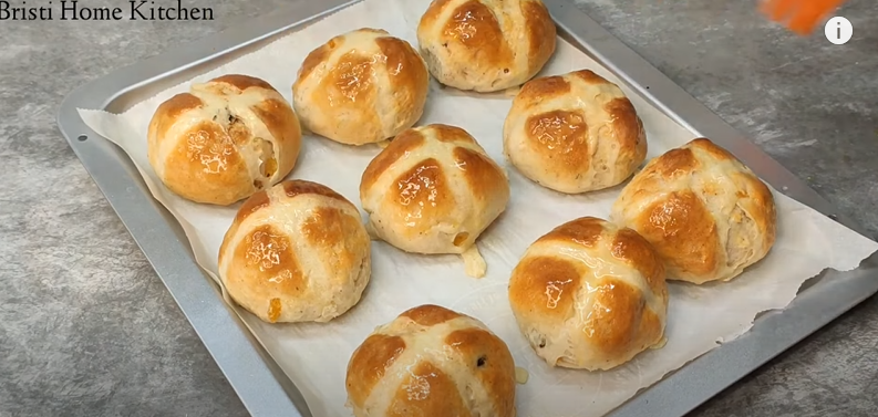 - Pour in a piping bag and make a cross design on the buns. Now, bake it at 180 degree celsius for 15 mins. Once done apply melted butter. It is now ready to be served.