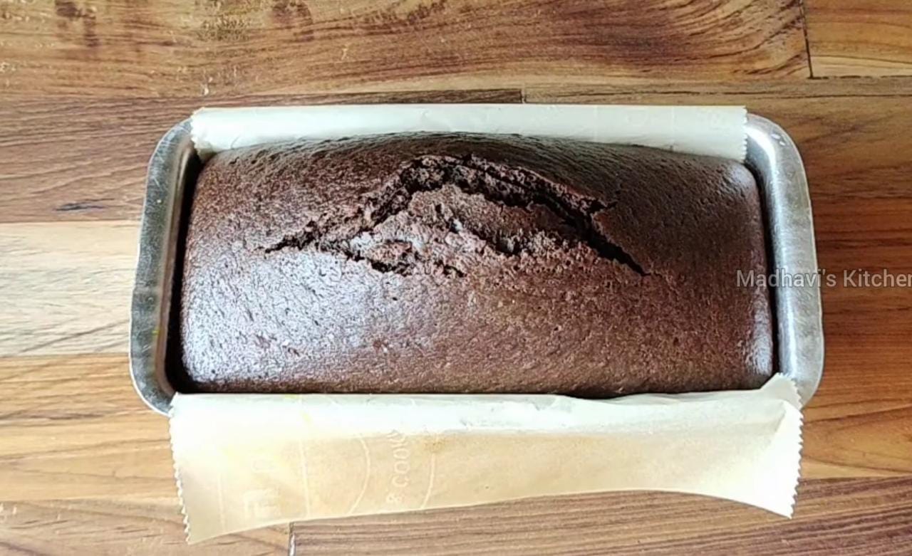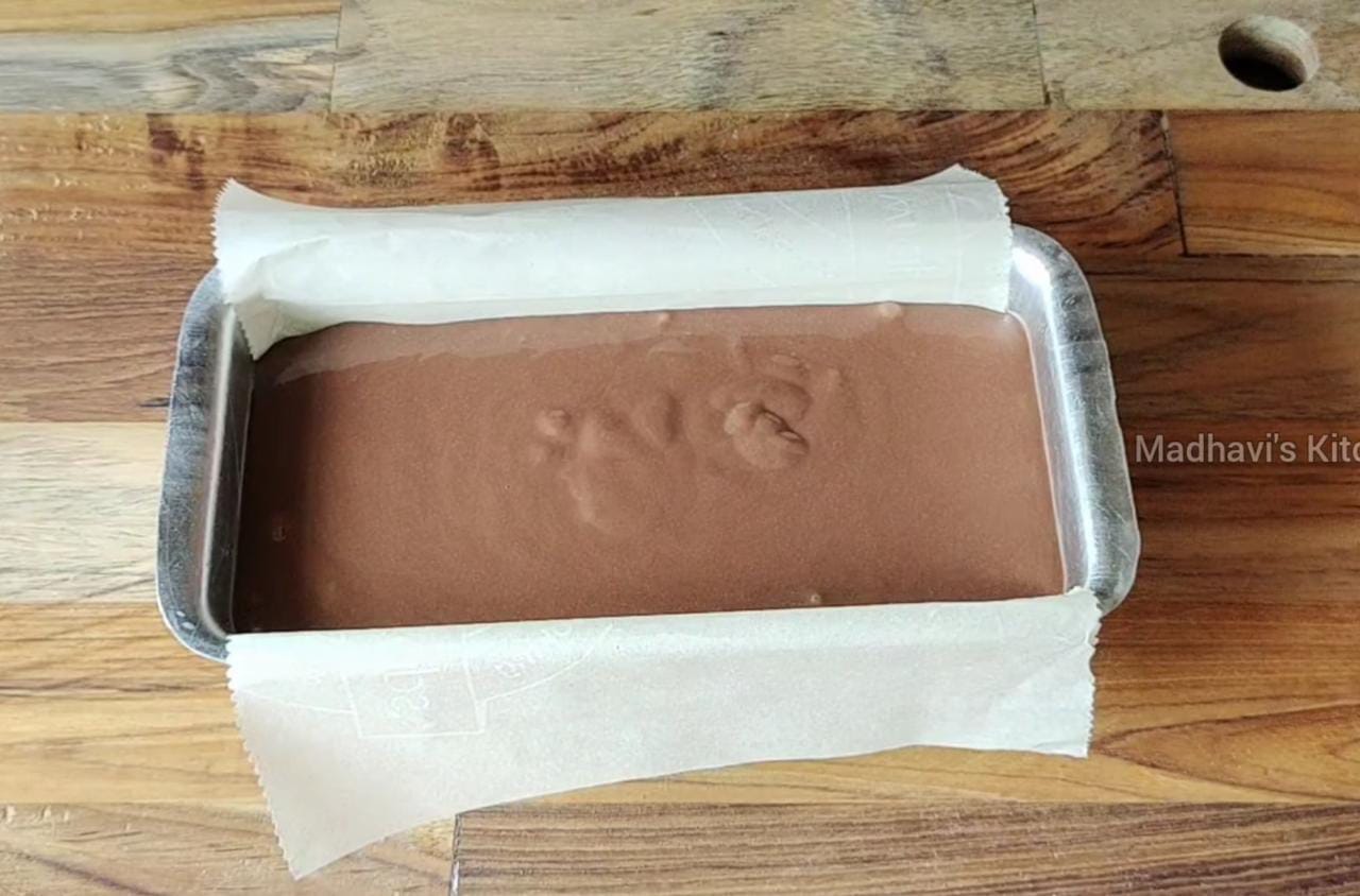 • Pour the batter to the cake tin and bake in preheated kadhai for 35-40 minutes at low medium flame.