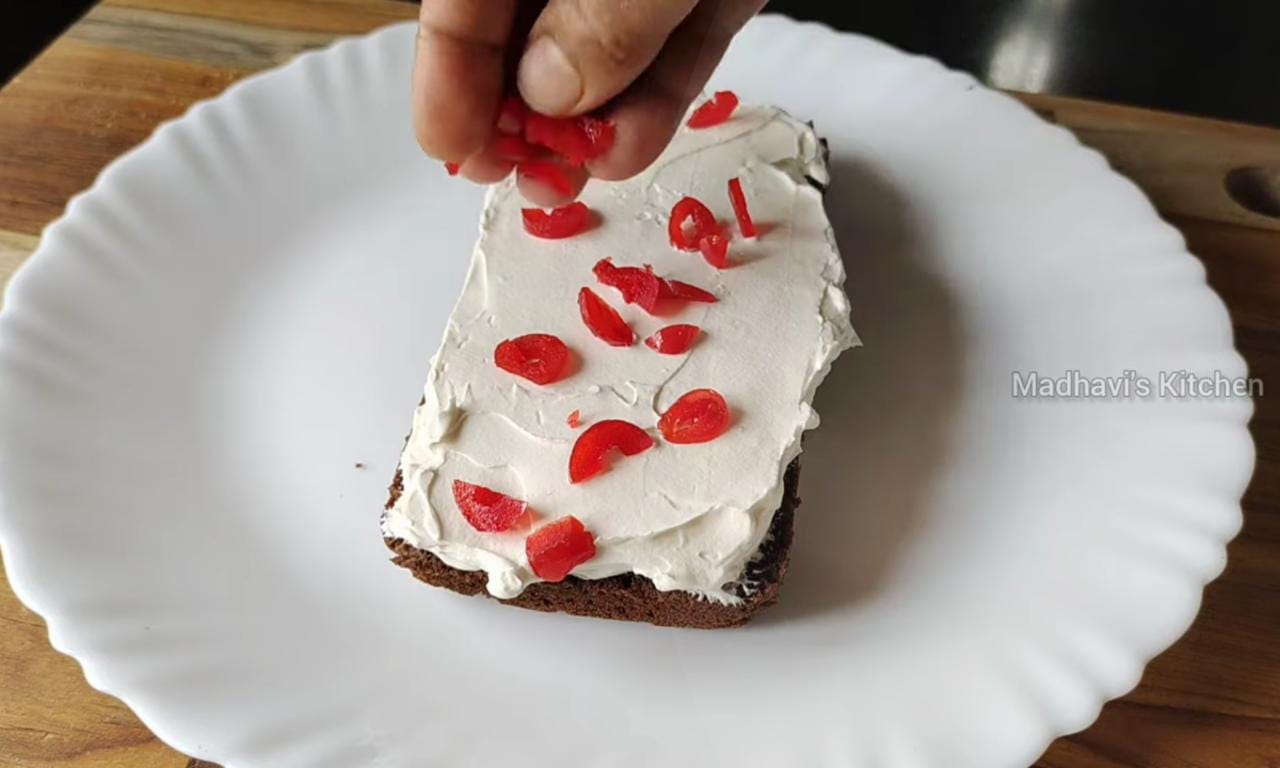 • Take the cake out of the tin and remove the upper layer. Cut the cake into 3 horizontal layers and add sugar syrup, vanilla ice-cream and chopped cherries in between the layers. Crumb coat the entire cake with the ice cream and make it smooth on all sides.