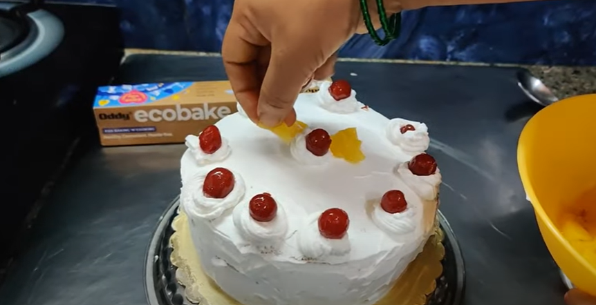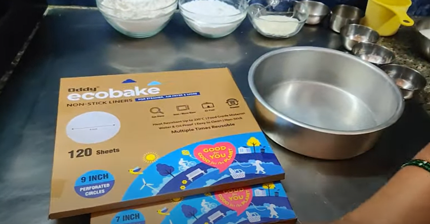 The pineapple cake is made from whipped cream smothered between soft layers of sponge cake and topped with slices of pineapple. This cake recipe is definitely one you must try if you are looking for an eggless cake. The Oddy Ecobake liner paper is used to line the cake tray to make a spongy, non-sticky cake.