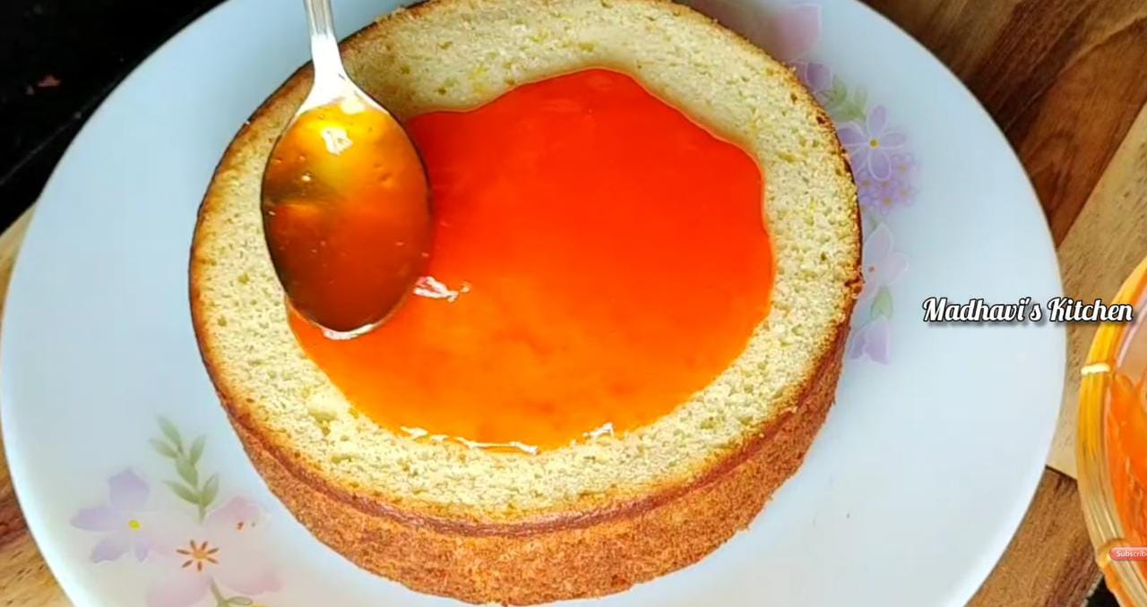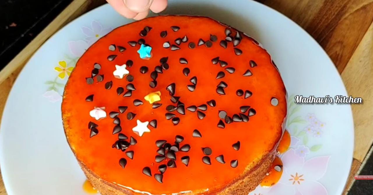- Trim the upper layer of the sponge cake. Then pour the orange glaze on the top of the cake and spread evenly. Then decorate with choco chips and other sprinkles.