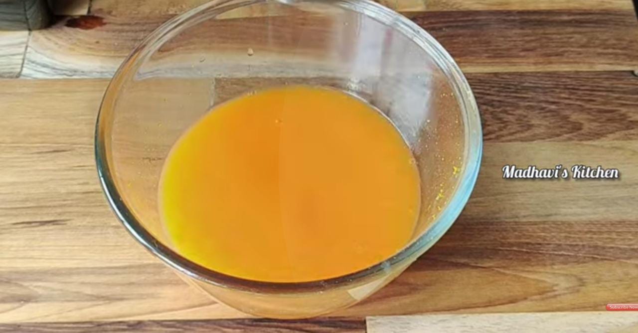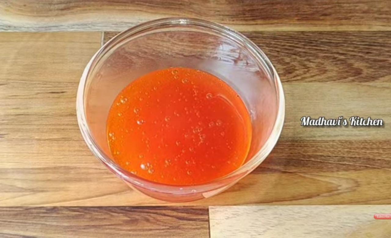 - Take another orange and take out 1/2 tsp orange zest and add squeezed orange juice, 1/2 cup water, 2 drops liquid orange food colour, 2 tsp corn flour, 4 tbsp sugar and mix well.