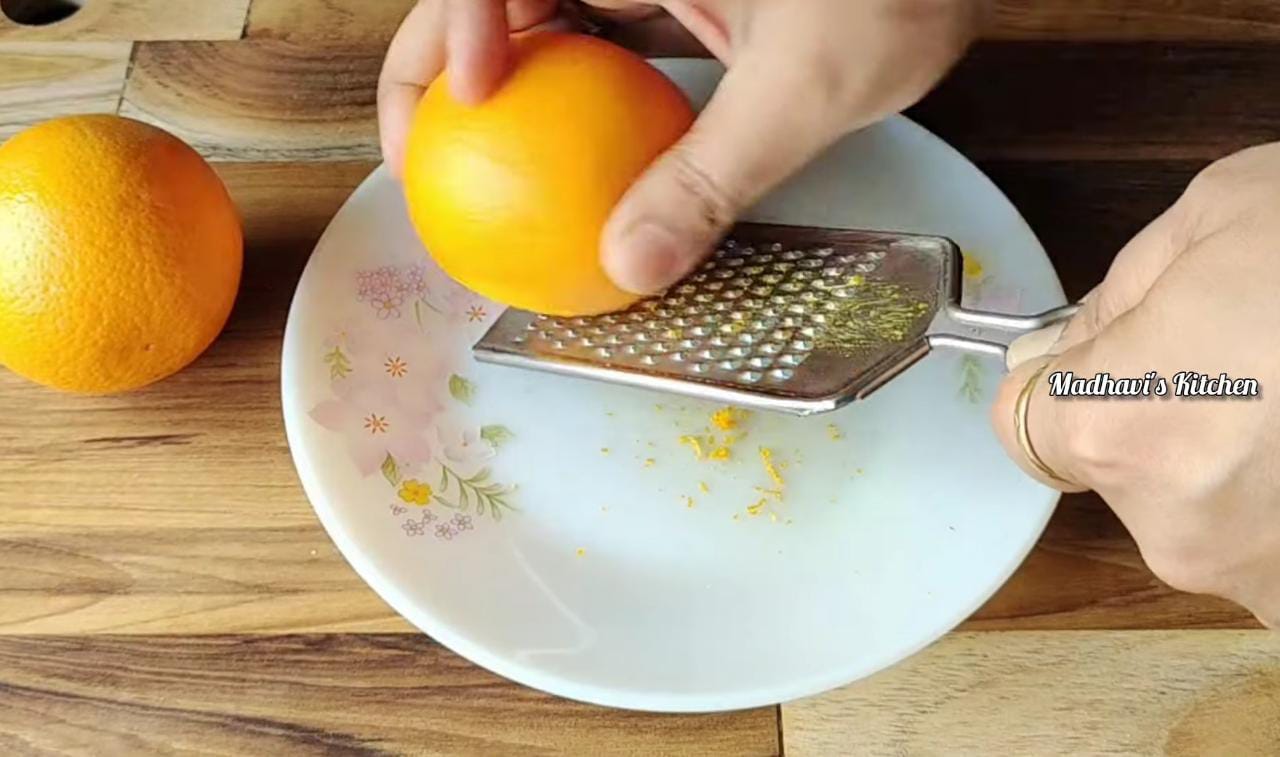 - Take 2 oranges and grate the outer peel and make 1/2 tsp orange zest.