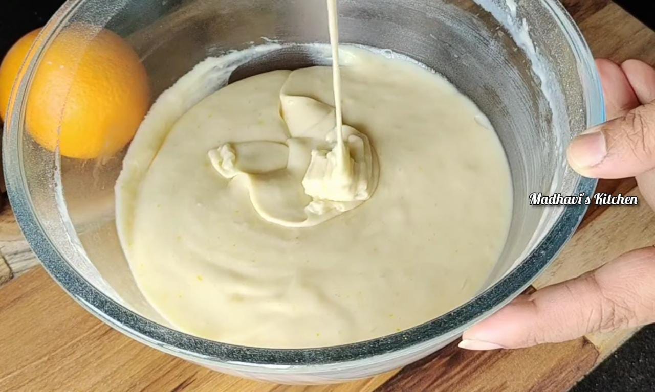 - Then add 1+1/4 cup maida, 4 tbsp milk powder , 1 tsp baking powder and 1/4 tsp baking soda and mix well. Add 1/2 cup milk and mix gradually. Then add the 1/2 tsp orange zest and mix well.