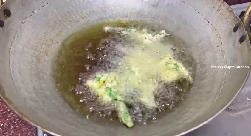 - Heat up refined oil/ghee in a kadai and then drop spoonfuls of batter in the oil.
