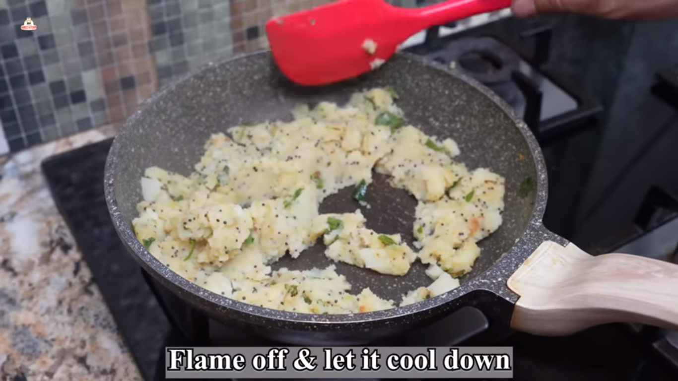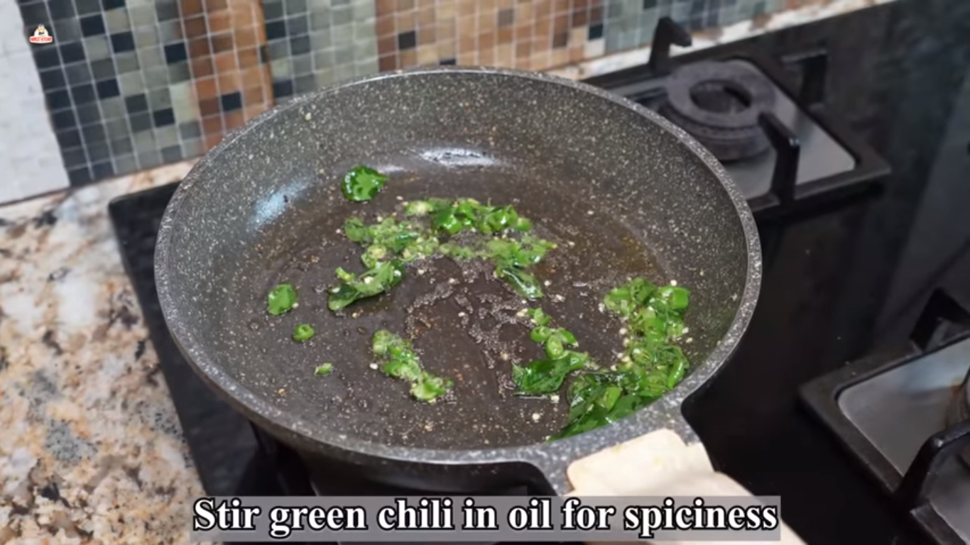 - Put some oil in a pan. Crackle mustard seeds. Add curry leaves and green chillies. Now add boiled potatoes and mash them.