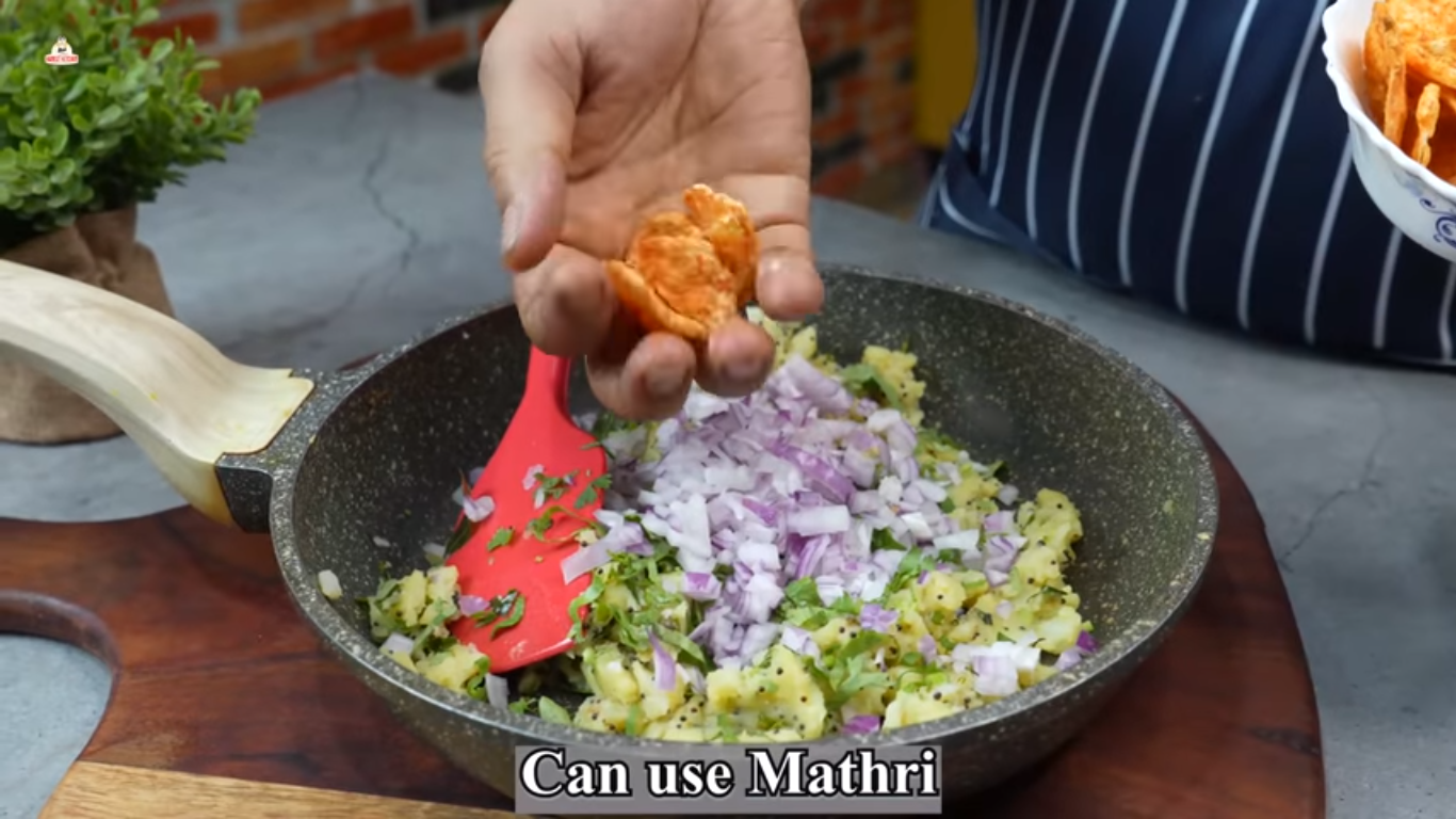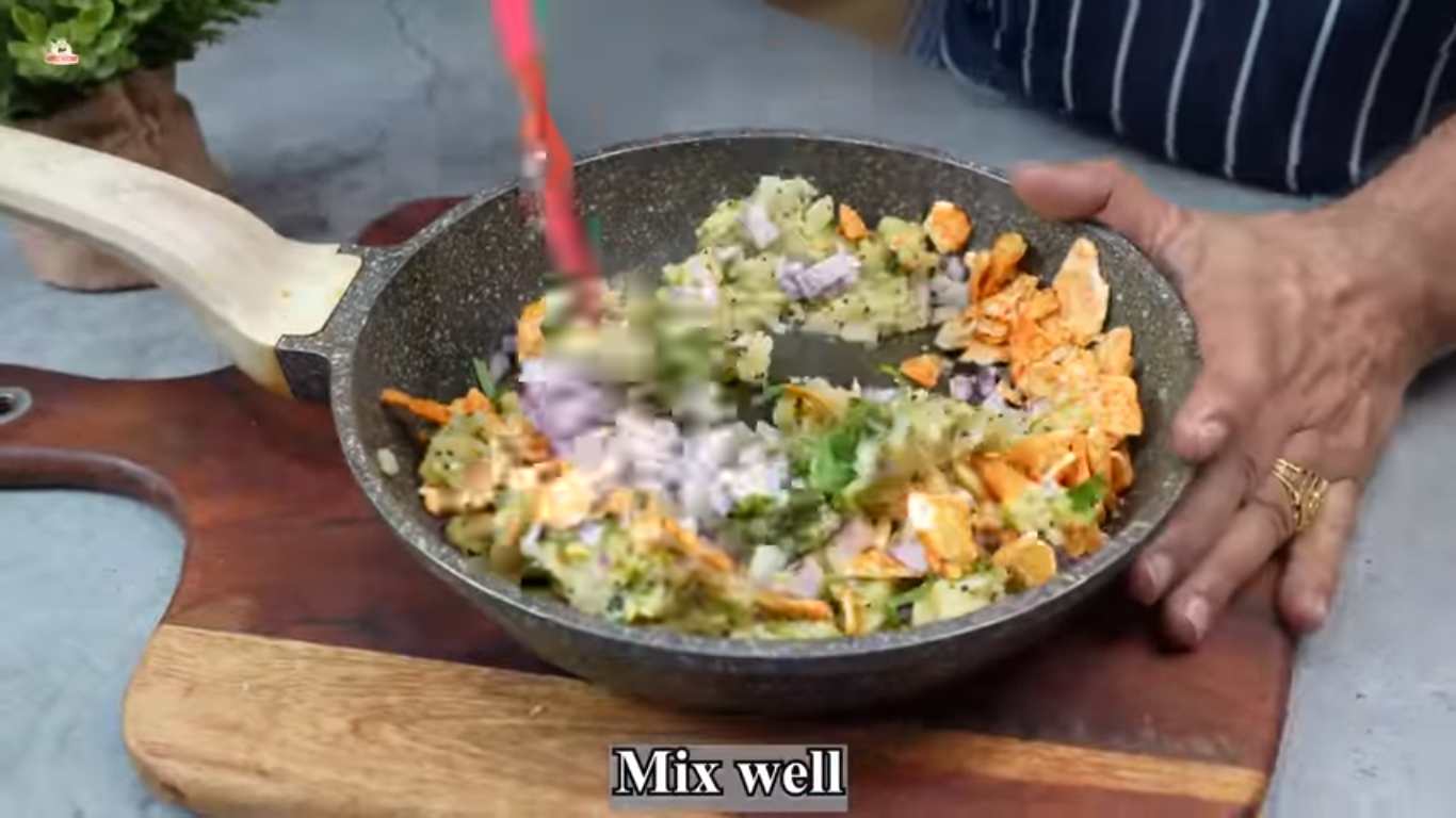 - Now, add chopped onion, coriander leaves and crushed potato chips. Alternatively you may use mathri as well.