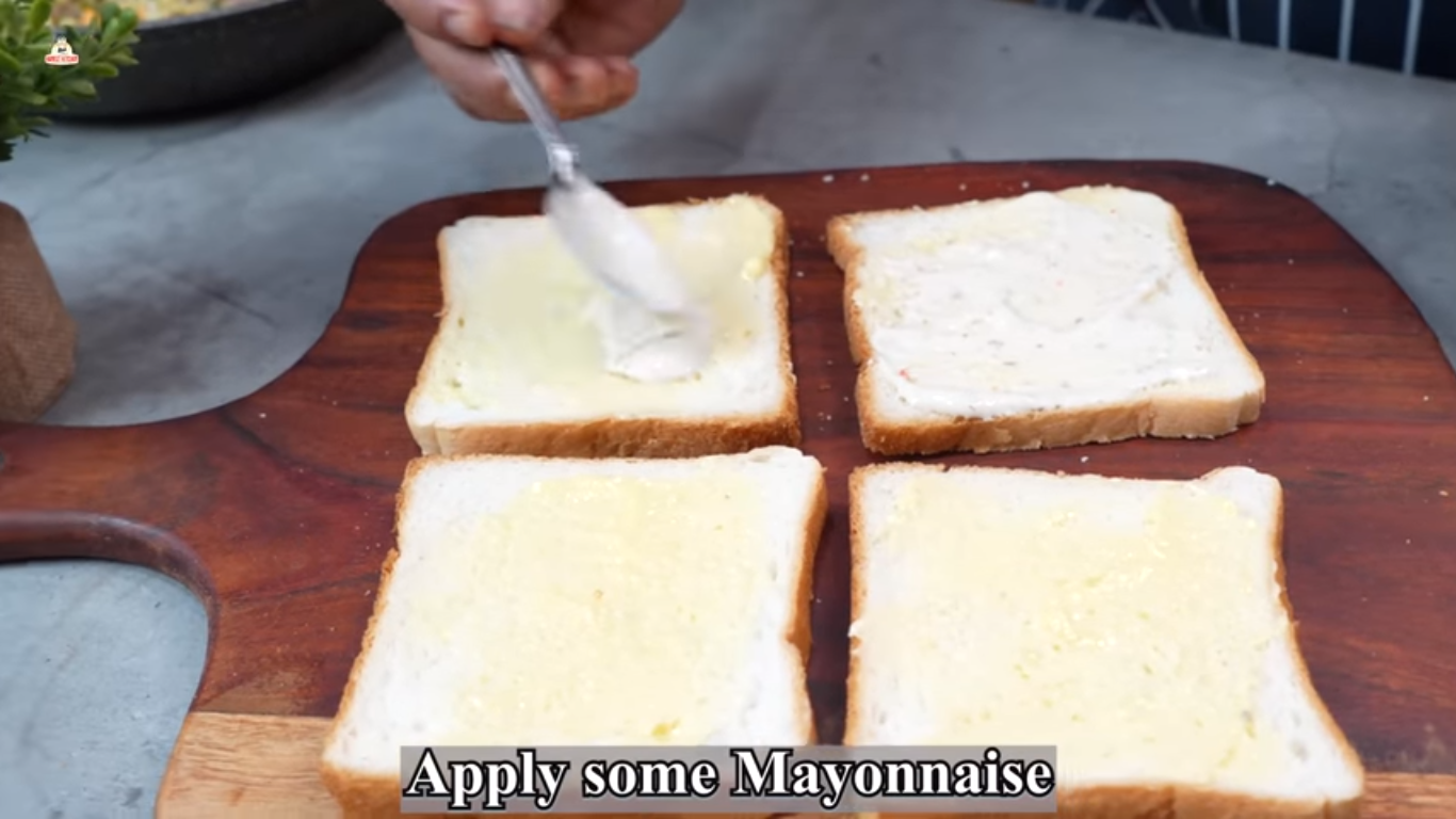 - Now take the bread slices and apply some butter on them. Additionally apply some mayonnaise as well.