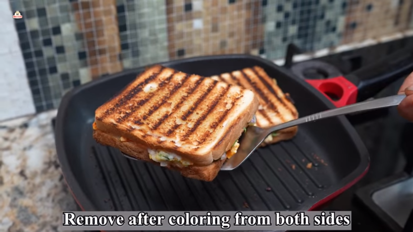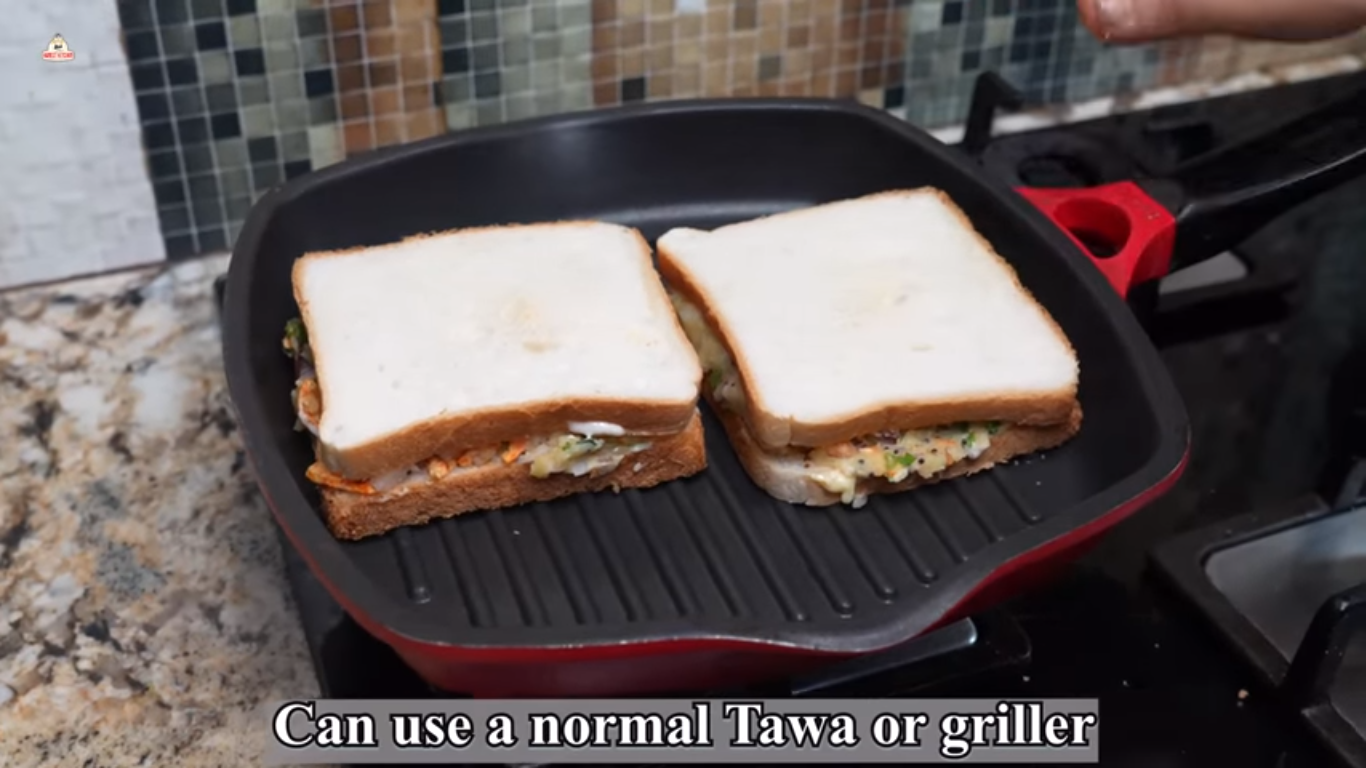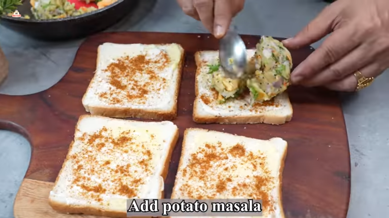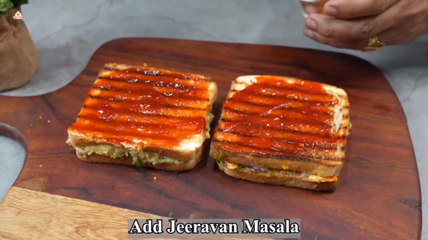 - Sprinkle Jeerawan Masala on these slices. Now spread the potato masala evenly on them. Cover and press it. Now grill these sandwiches on a tawa or griller on a high flame till they are crisp.