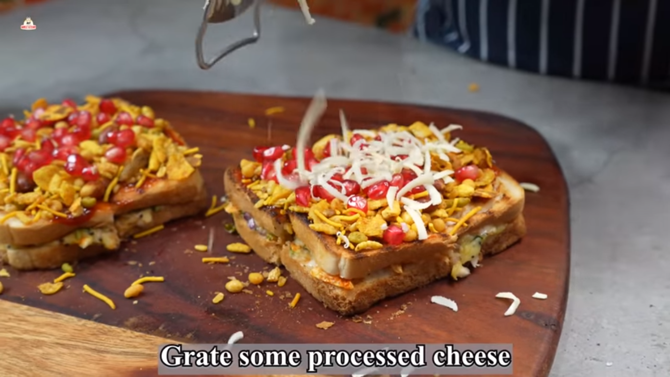 - Sprinkle some jeerawan masala over the ketchup. Now cut this sandwich into four equal pieces. Now top it with some mixture and pomegranate seeds.