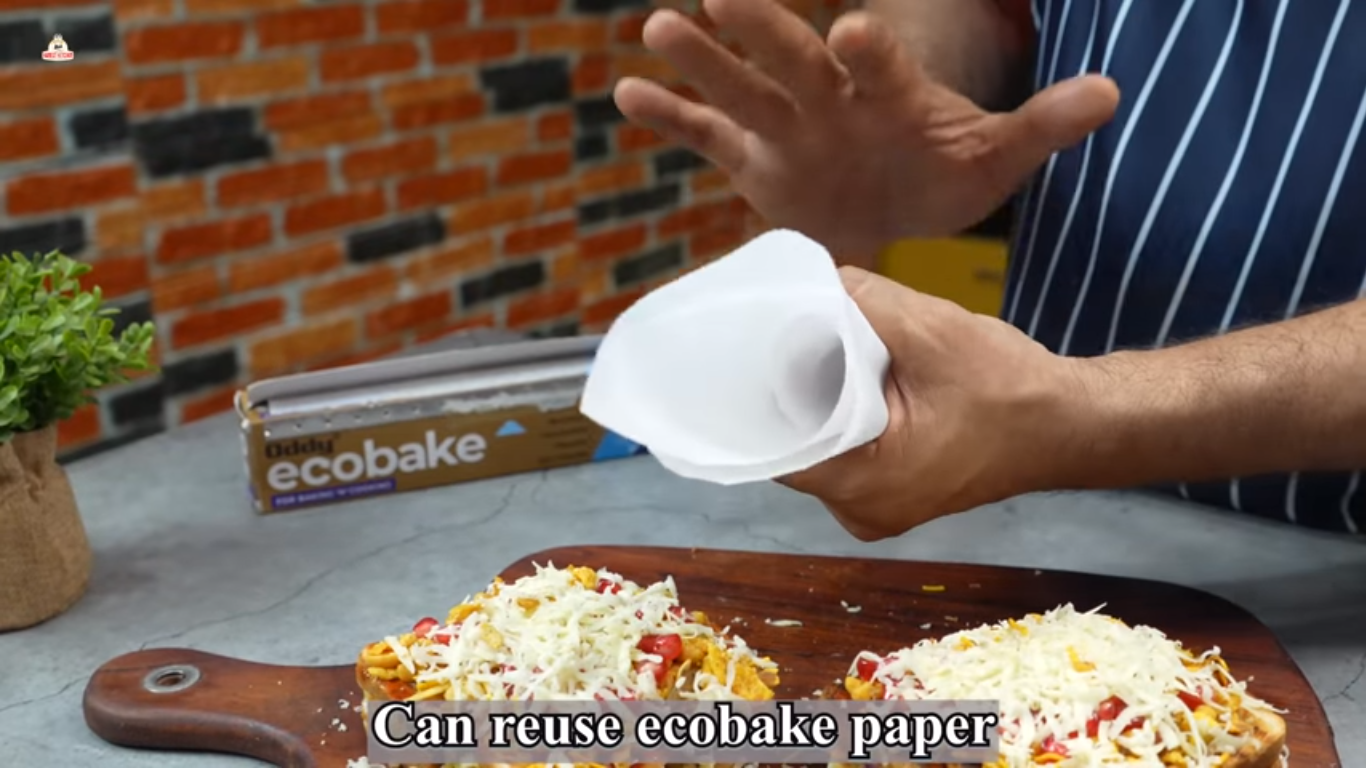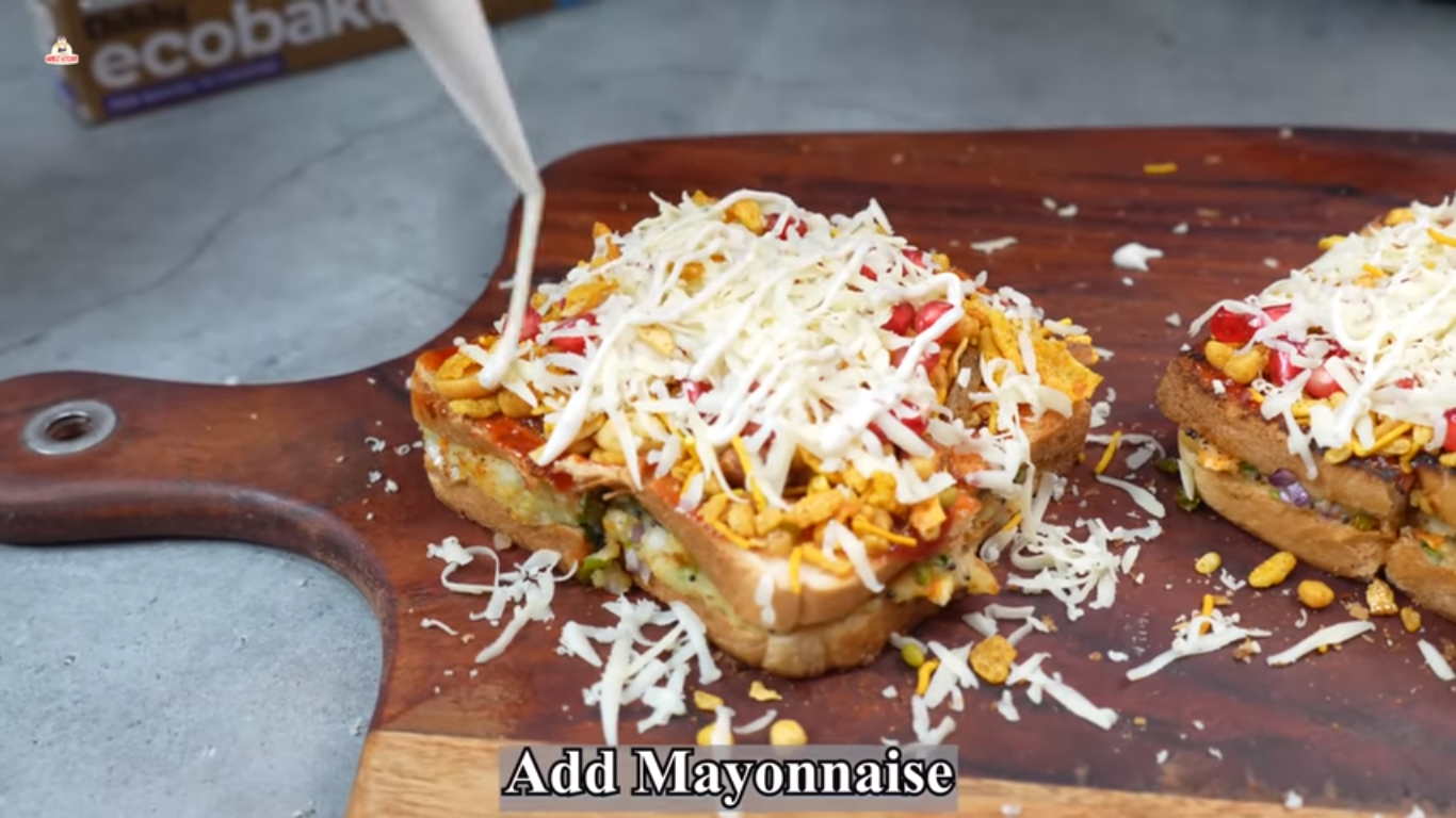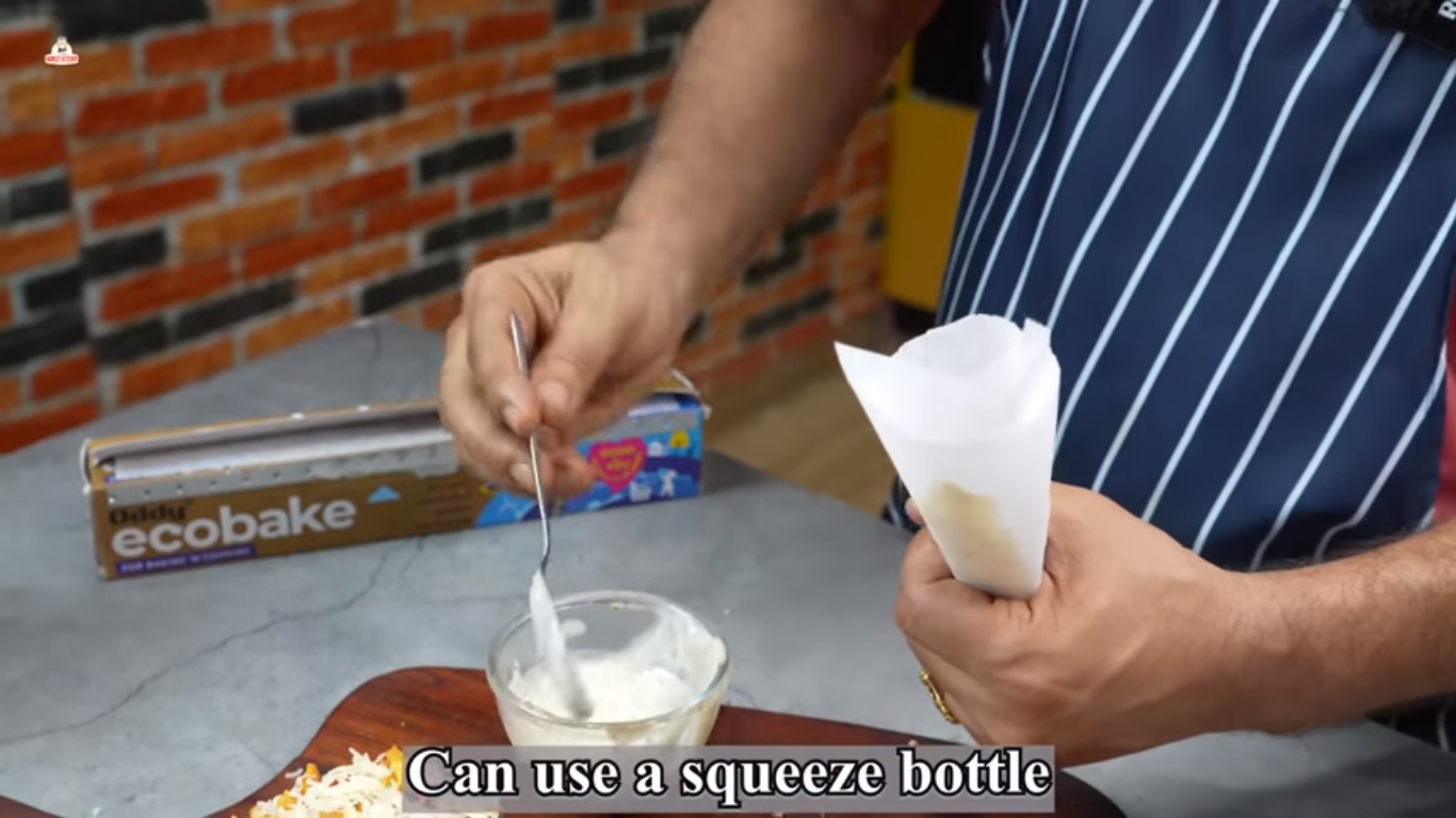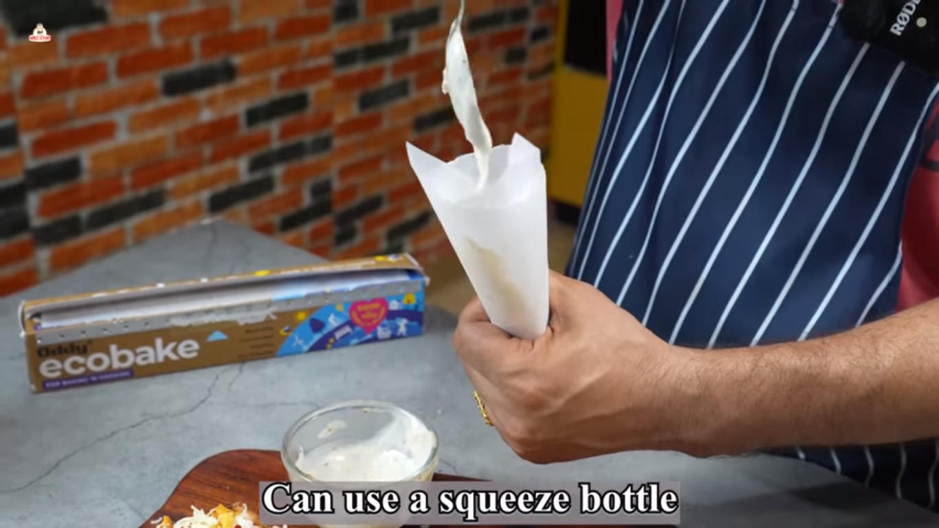 - Now garnish it with grated processed cheese. Now, using a piping bag made out of Oddy Ecobake, add mayonnaise for a creamy texture and serve.