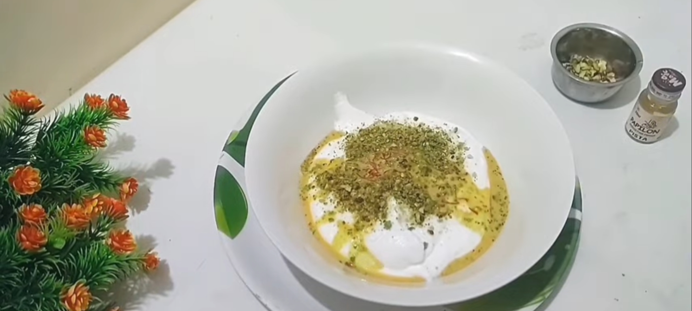 • In a small bowl add warm water and add some strands of saffron. Take ice cream base in a bowl and add crushed nuts, kesar milk mixture, pista essence, liquid yellow color and mix well.