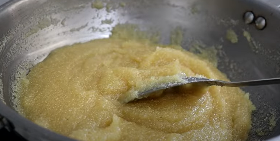 • Once the sugar and jaggery are completely melted, add the roasted rava to it and cook. Once the rava and jaggery mixture thickens, switch off the stove and let it cool.