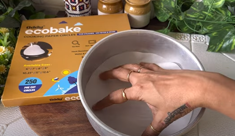 - Sieve the dry ingredients into the bowl and mix them with the wet ingredients to prepare the cake batter. Transfer the cake batter into a cake mould lined with Oddy Ecobake.