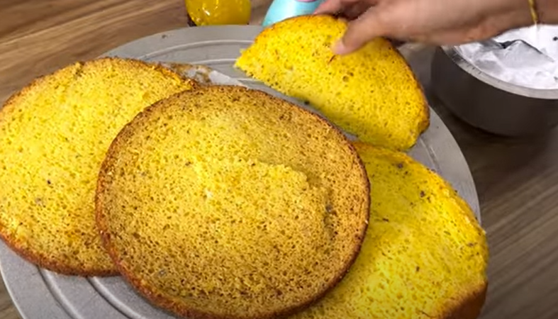 - Bake the cake for 20 to 25 minutes in a preheated oven at 180 deg C. Once the cake is baked and cooled, trim the upper part of the cake. Then divide the cake into 3 equal parts.