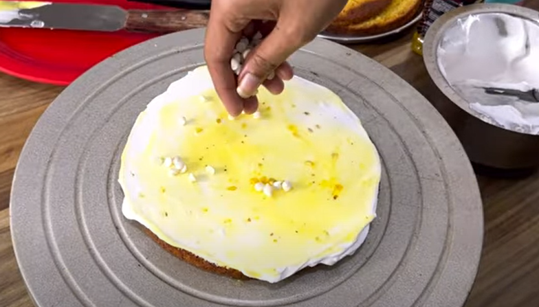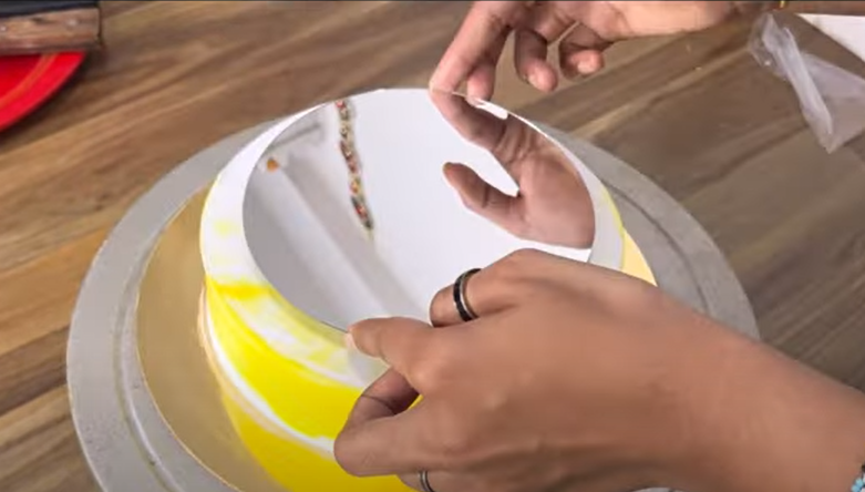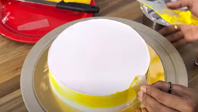 - Now repeat the same process for the second and third layers of the cake. Frost the cake completely with the cream and level it using a card and spatula. Apply yellow cream on the sides of the cake using a plastic card as shown.