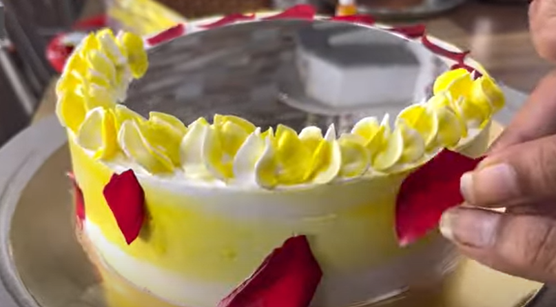 - Place the acrylic mirror in the centre of the cake. Make flower designs on one half of the cake using a star shaped nozzle with yellow and white cream. Garnish with rose petals on the sides and the other half of the cake as shown.