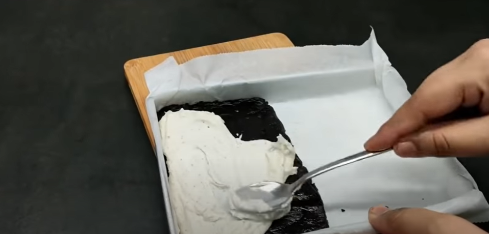 • Take half a portion of the dough and spread it evenly at one end of the tray lined with Ecobake cooking paper. Make the separated cream into a fine paste and add 1 tbsp of milk to it. Now spread the cream paste on the dough evenly on a tray. Refrigerate the tray for 20 minutes.