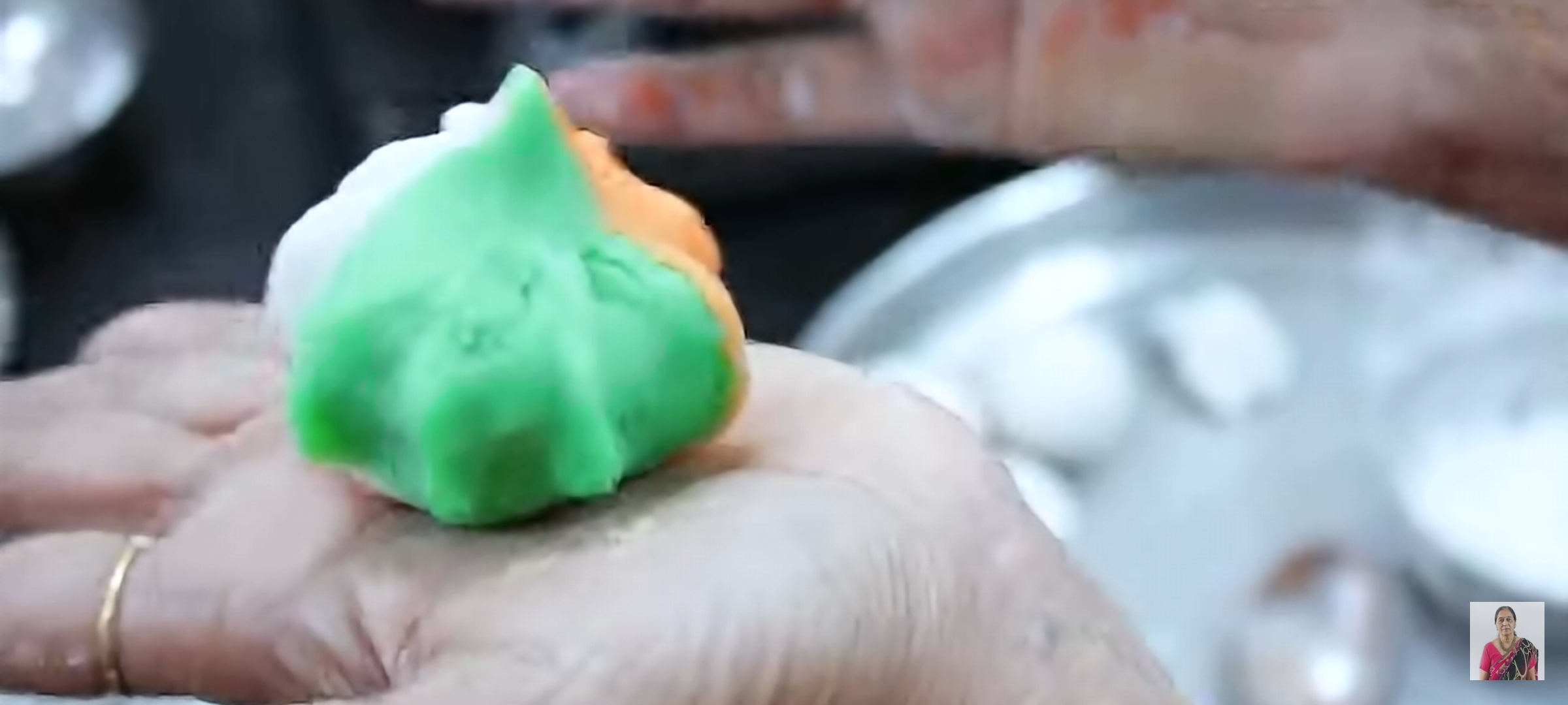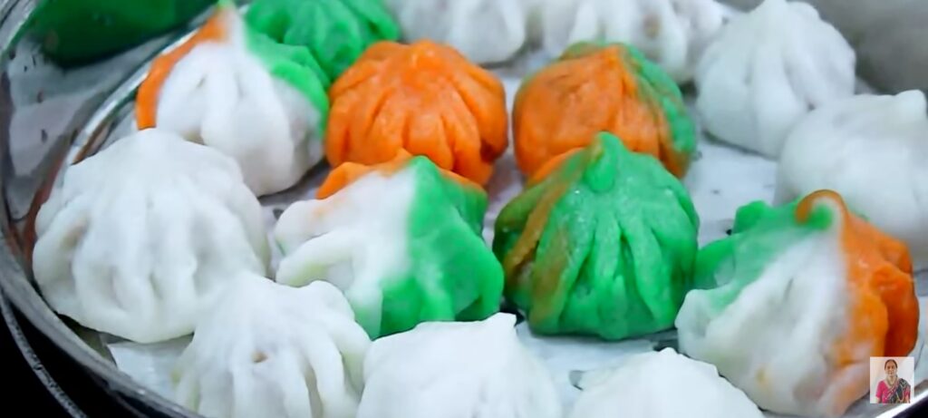 • Add orange and green food color to one part of the dough. Now flatten it as shown in video and use the rice flour or ghee to make the shape of modak. Fill it with the modak mixture and fold it to cover the edges. It should form the shape of modak. Repeat the same process with the rest of the dough.