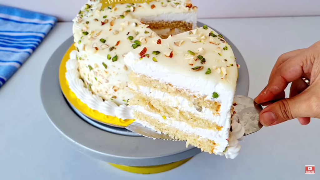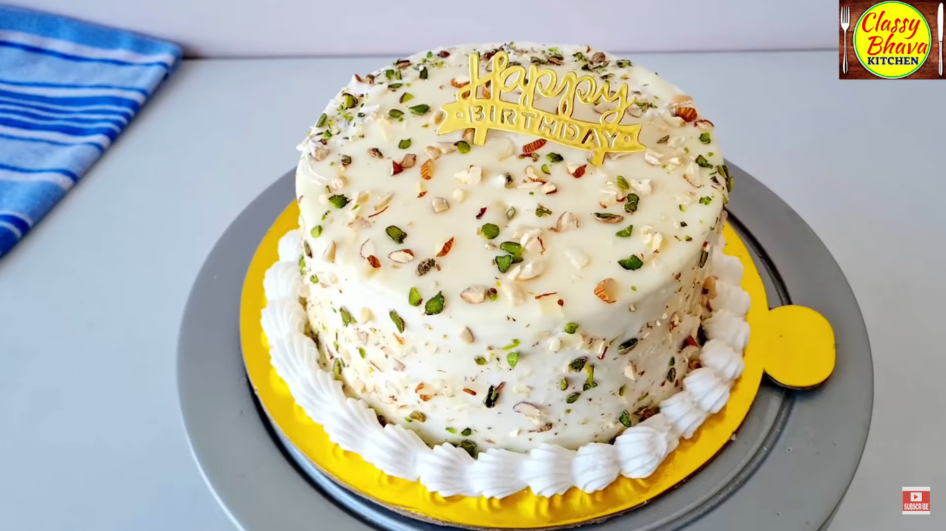 - Pour the milky glaze on the cake top as shown in the video, sprinkle some chopped nut on the cake. Using a closed star shape nozzle makes a beautiful design at the cake bottom as shown.