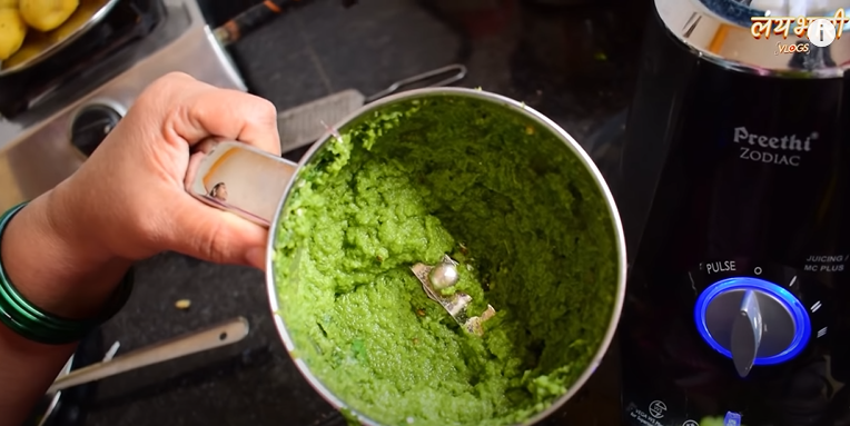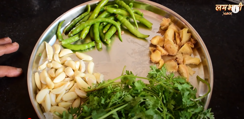 - Grind a handful of fresh coriander leaves, 10-12 green chilies, 2 garlic cloves, and 2 inches of ginger. Grind it to a fine paste with little water.