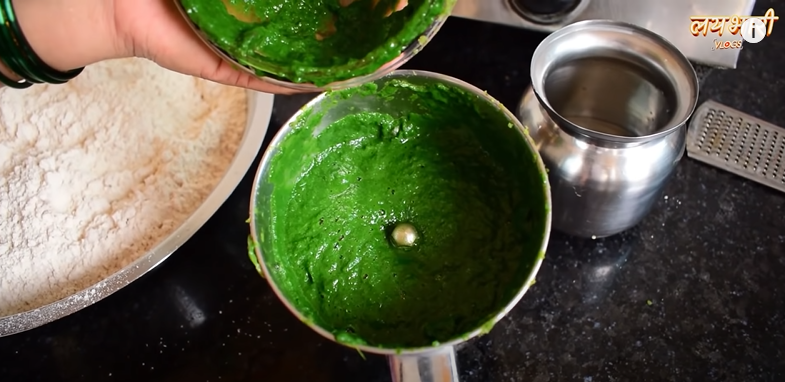 - After the palak has cooled, grind it to make a puree. Take wheat flour, add sugar, turmeric powder, coriander powder, cumin powder, Ajwain, and lime juice, Mix it.
