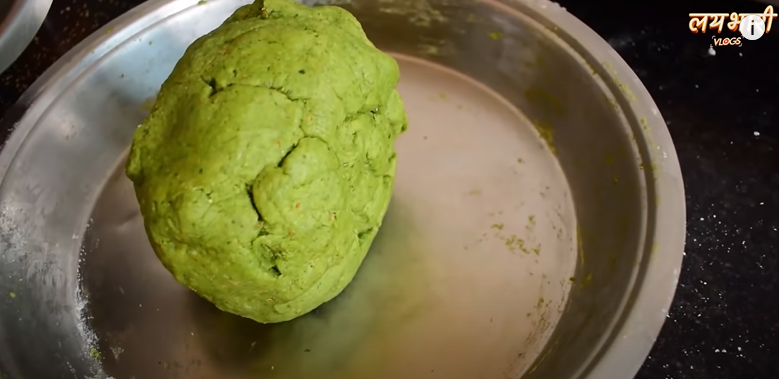 - Add 2-3 tsp oil, and half the quantity of the chili, coriander masala, and whole of the palak puree. Mix it and knead a dough.
