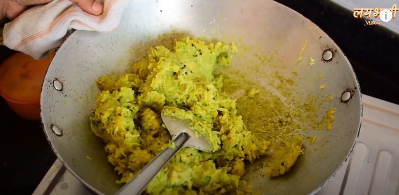- Add turmeric powder and salt as required and mix well. Cook till oil leaves the sides. Add the grated potatoes and mix till everything is well blended.