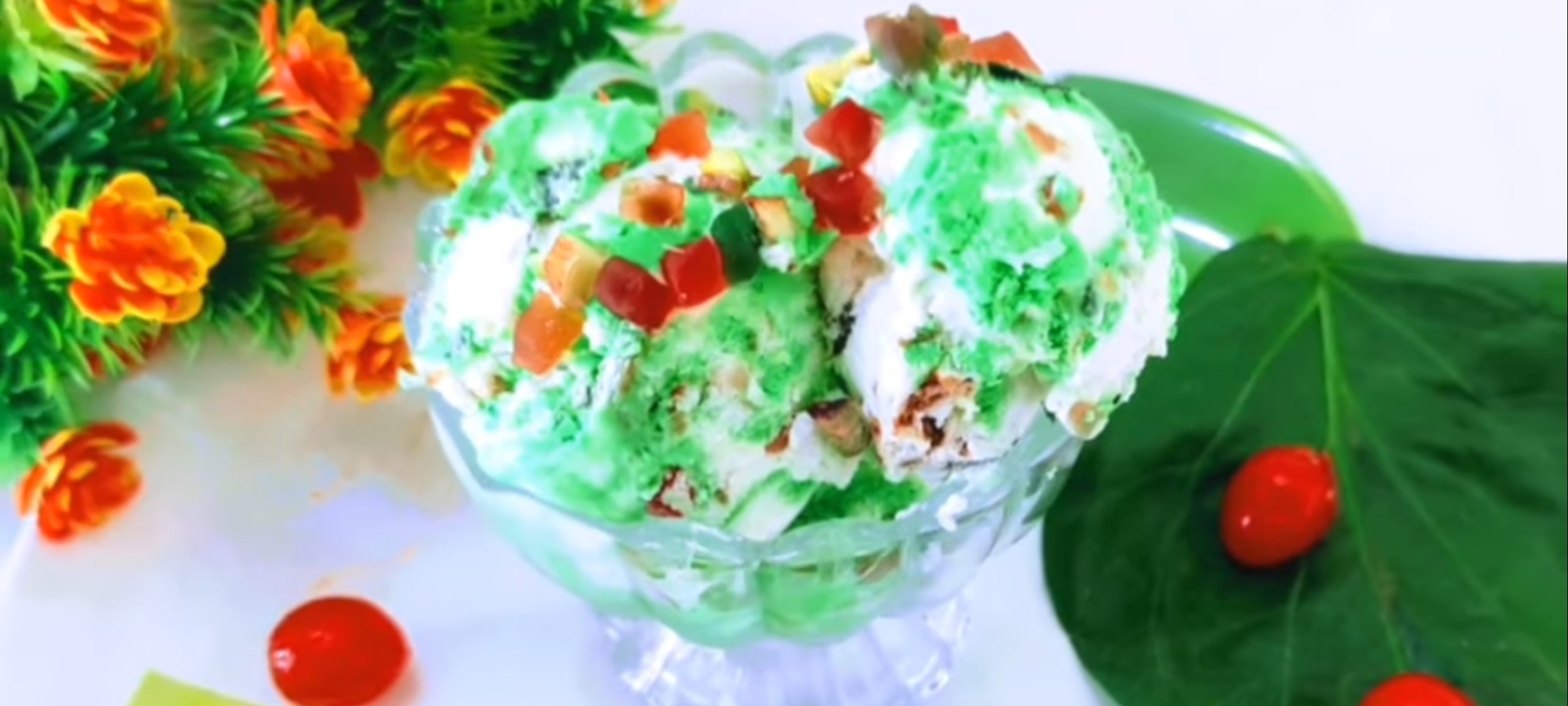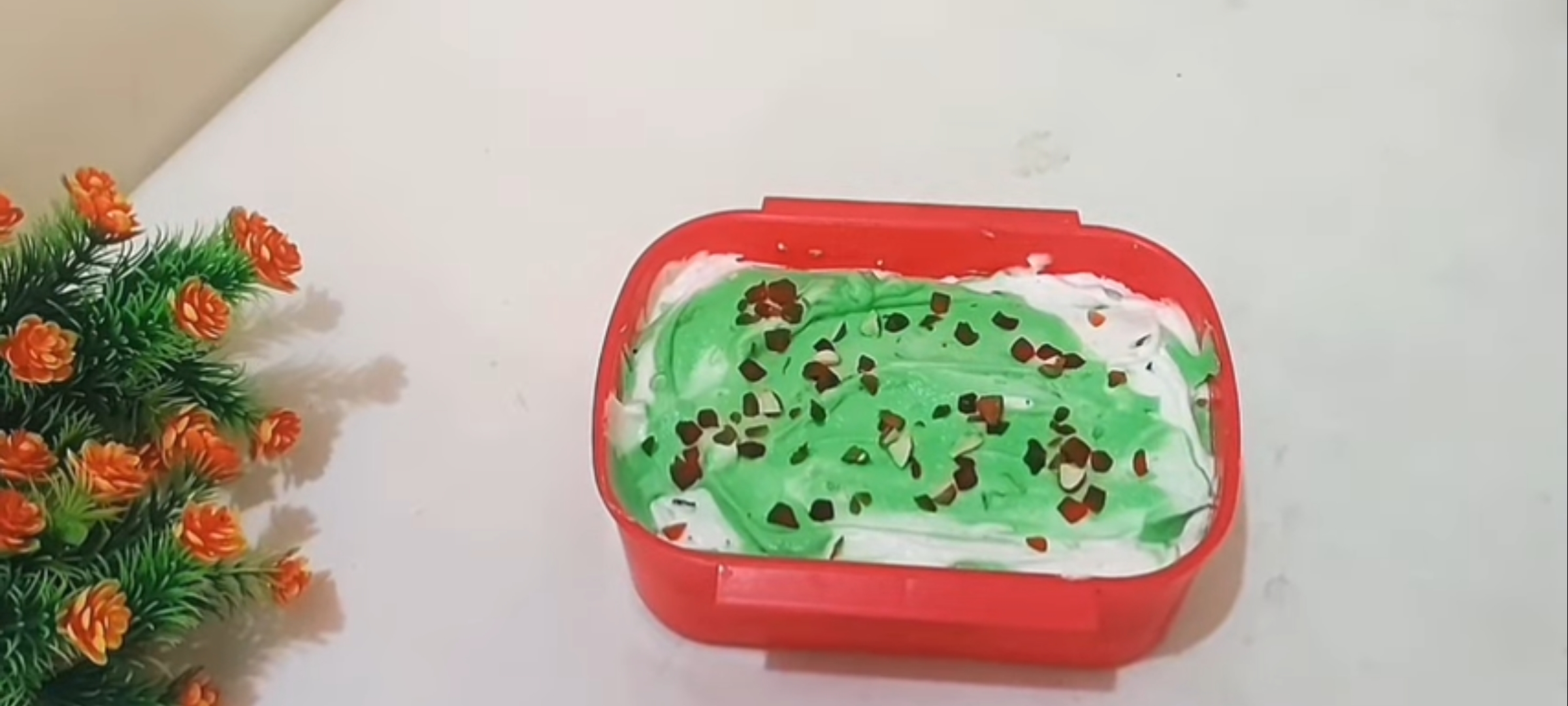 - In a small bowl add the ice cream and add liquid green color. Now take a container and add white color ice cream and one layer of green color ice cream. Keep on repeating for 2-3 times then tutti fruity and dry fruits on top.