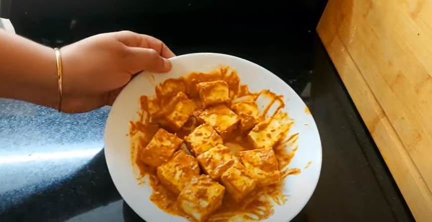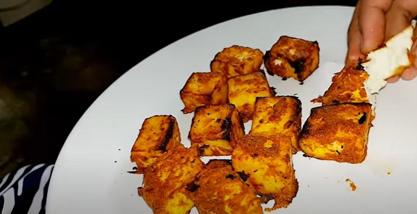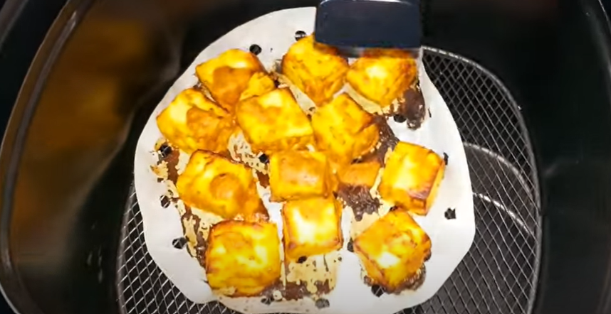 • Transfer the marinated paneer cubes to the air fryer. Grill the paneer cubes for 15 to 20 minutes in the air fryer. Your tasty paneer tikka is ready.