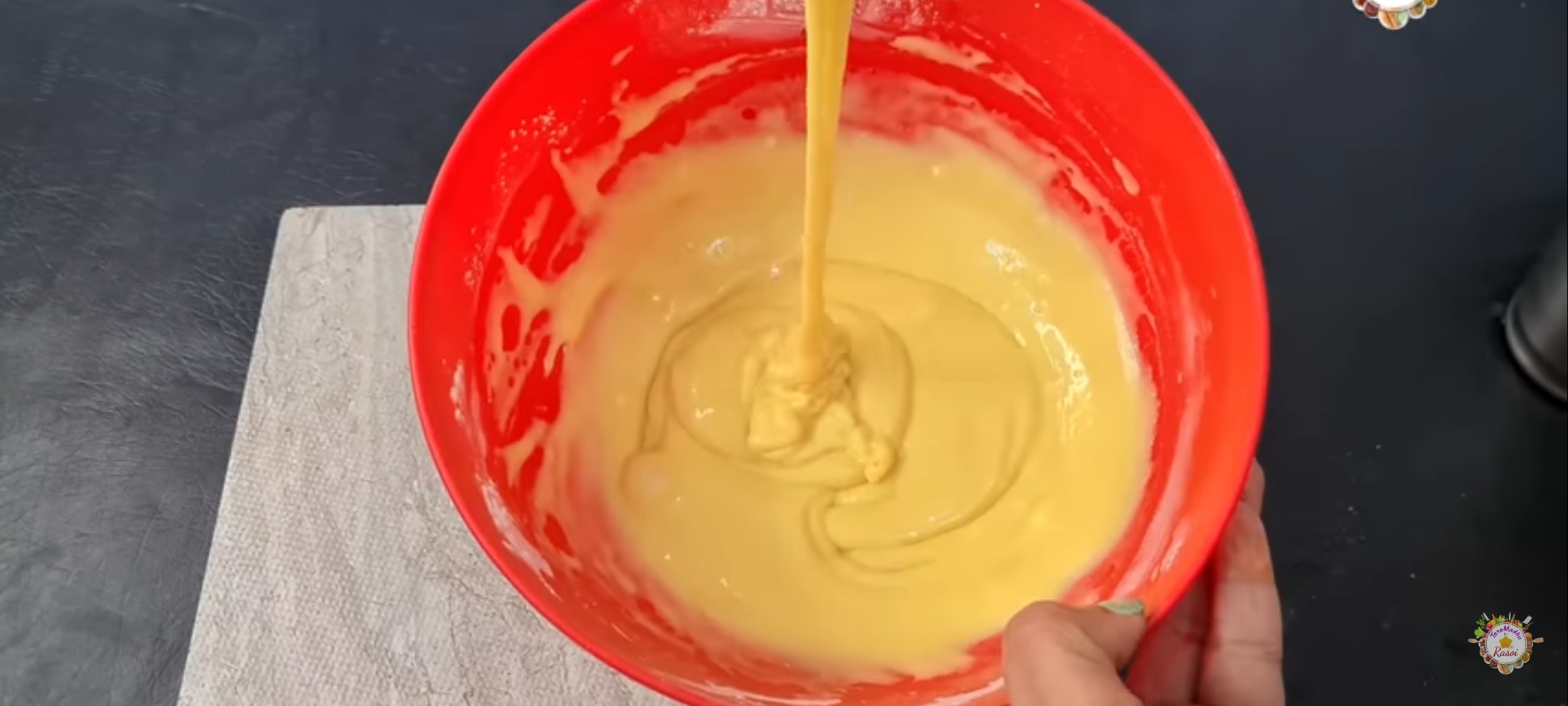 • In a bowl add white chocolate compound and 1/4th cup water. Microwave for 20 secs. Mix well and add green color, mix and strain nicely.