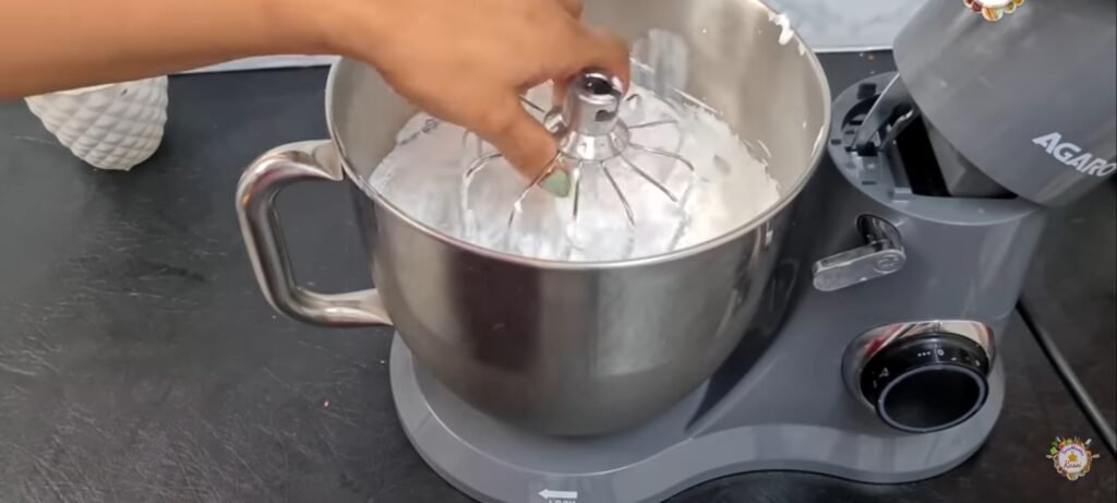 • Demold the cake once cooled and cut the cake into 3 layers. Whip the whipping cream nicely until stiff peaks are formed. Take an 8-inch cake board and apply a little whipping cream in the middle. Place once layer of cake sponge and apply sugar syrup on it. Add whipping cream and spread evenly.