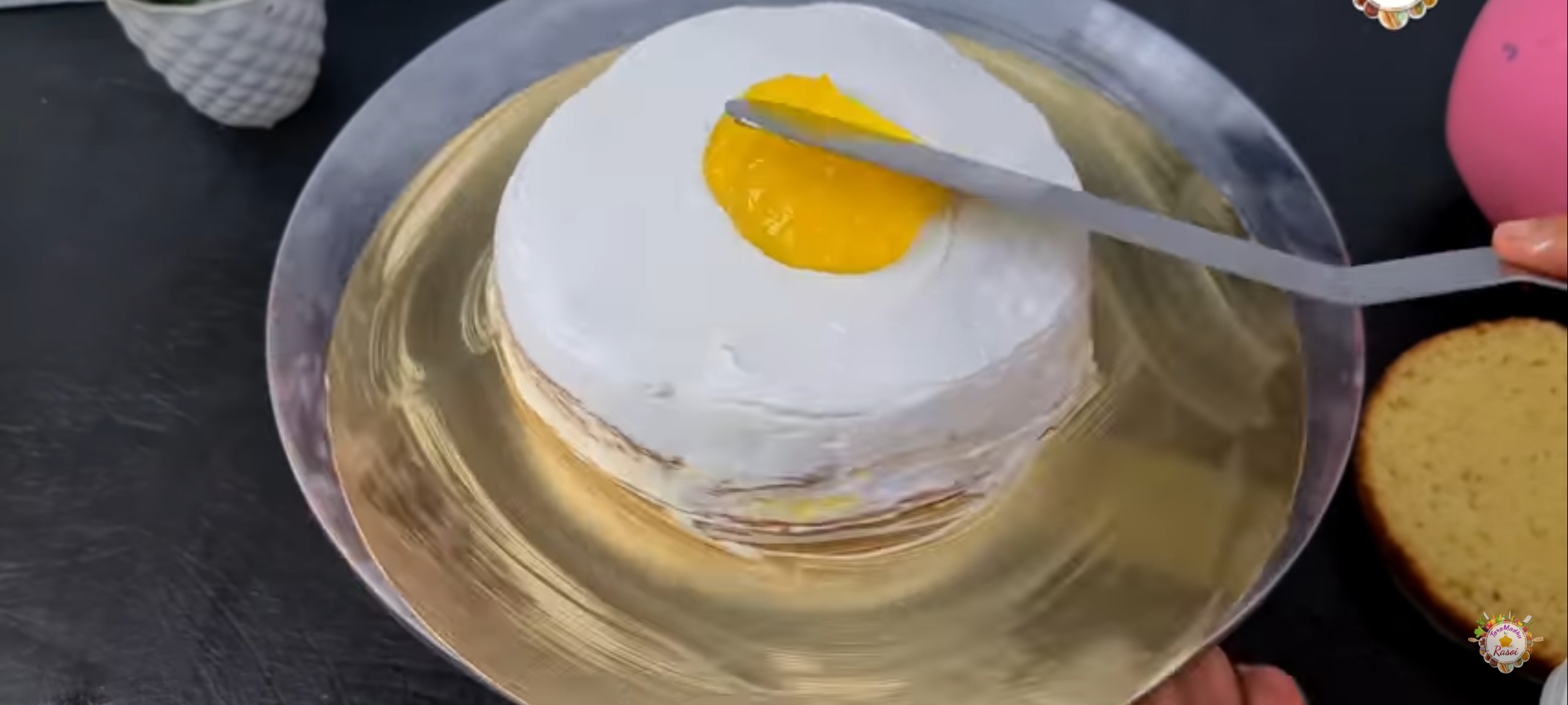 • Add pineapple crush and spread evenly. Add pineapple filing. Repeat the same process for the next two layers. Crumb coat the cake nicely. Keep the cake in fridge for 10 mins. Fill the piping bag with whipping cream and keep applying on the cake from sides to top.