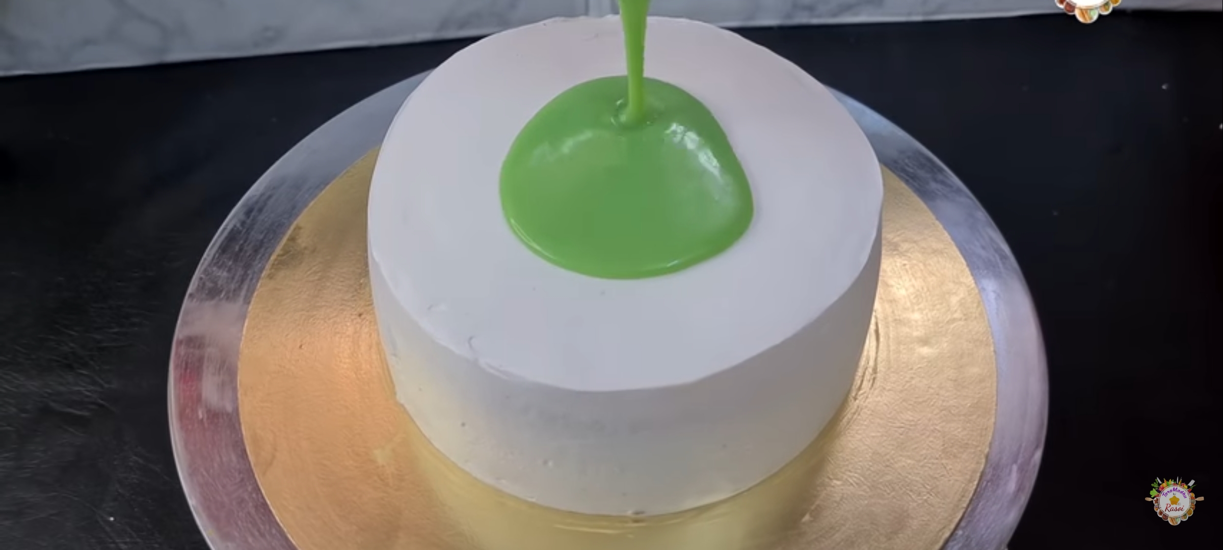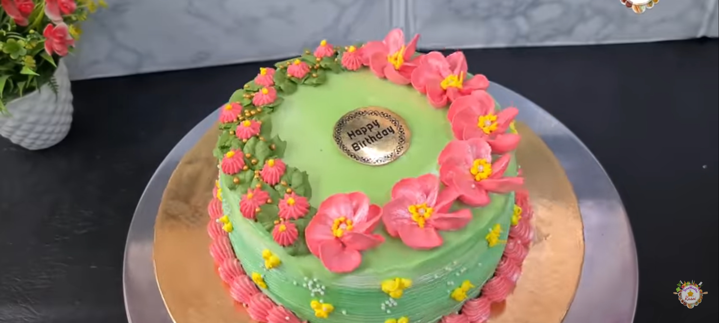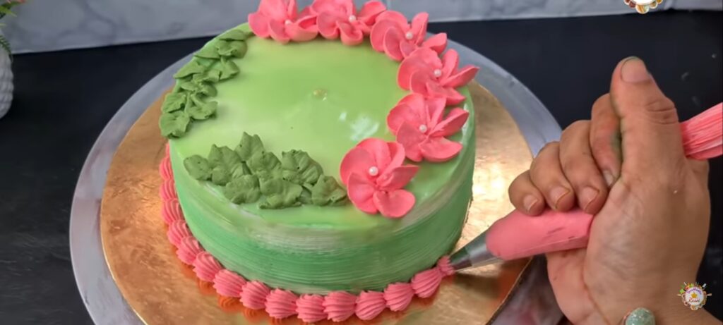 • Pour the ganache on top of the cake. Spread evenly with spatula. In a pipping bag add pink color and attach noor 44 nozzle. Make petal flower designs as shown. Add green color whipping cream to make branches and leaves for detailing. Make border with star nozzle.
