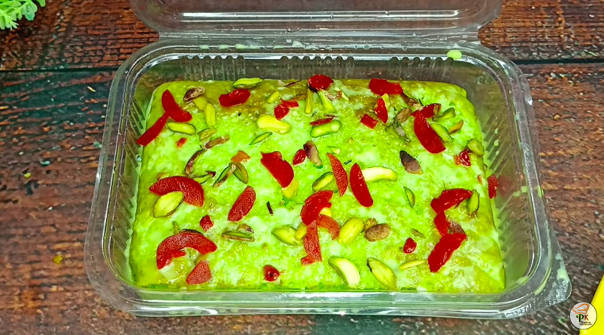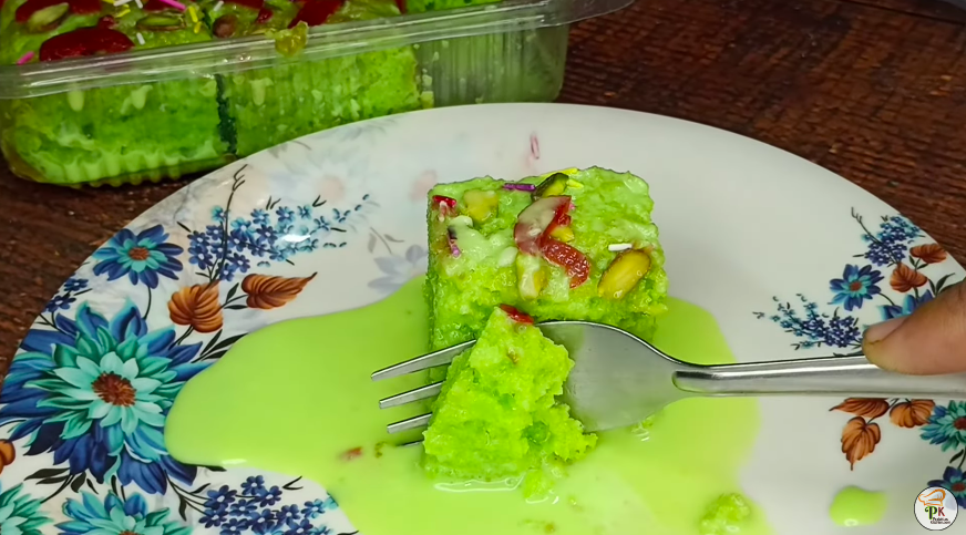 - Allow milk to cool at room temperature and then refrigerate for a while Demould pistachio cake after cooling and prick with fork.