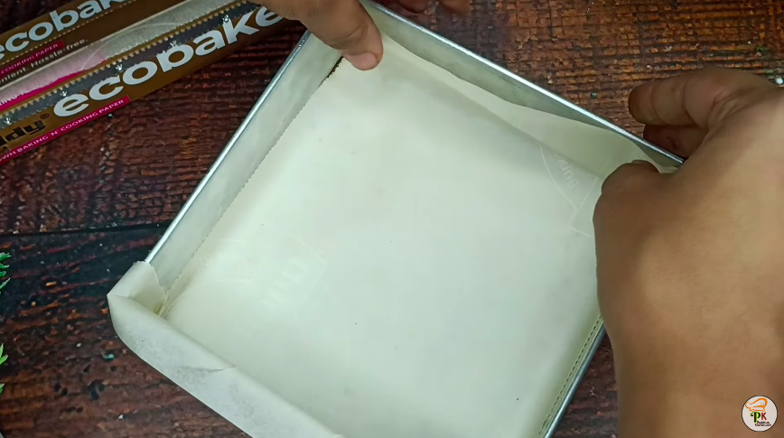 - Take 6 inch tin and line it with Oddy Ecobake brown and pour batter into tin. No need to grease as well.
