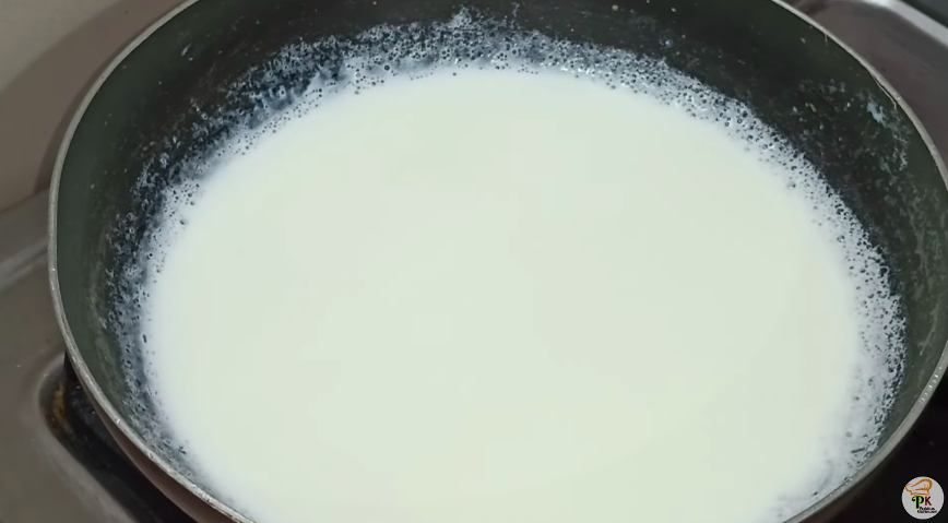 - For pistachio milk, take a pan and boil milk, add sugar, white chocolate green colour and essence.