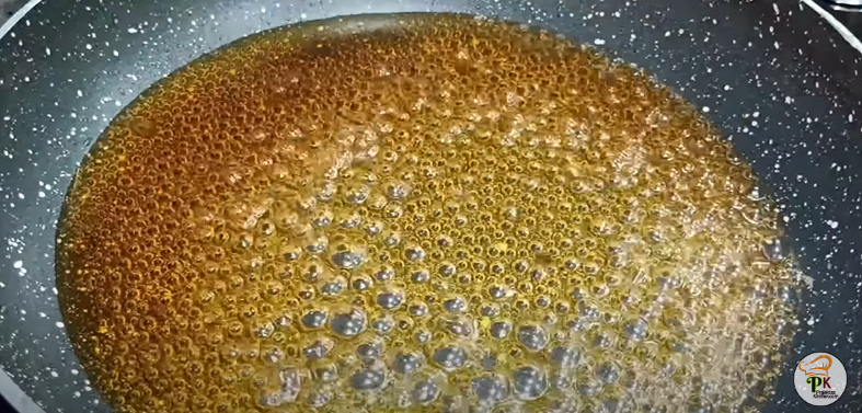 - In a pan melt sugar and caramelize it. Once it thickens, add water and keep sitting until it dissolves. Now add orange juice and stirr it.