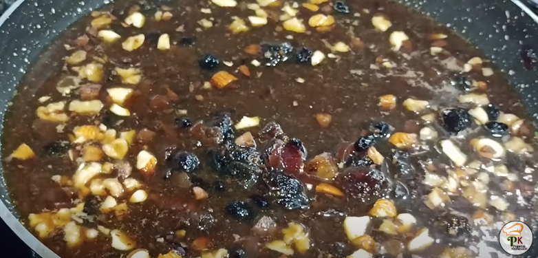 - Now bring this mixture to a boil. Add all the chopped dry fruits the mixture. After 2 mins, add oil and butter to the mixture and mix it till butter is completely blended.